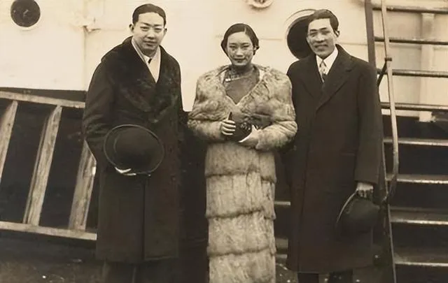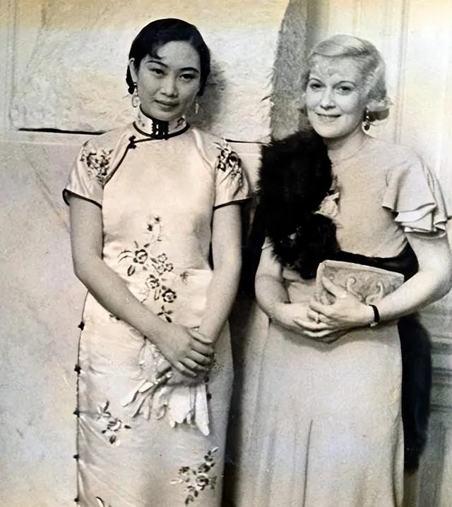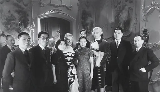 这张像赴宴前的合影,墙面装饰复杂,西服礼裙一片亮,胡蝶立在中间,旗袍花纹细密,几国人站一处,笑各不相同,旧上海的混杂味道就长在这种场面里。