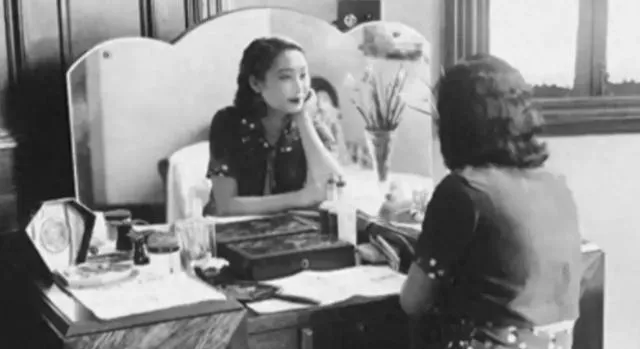 梳妆台镜面厚重,木纹发亮,瓶瓶罐罐各就各位,人托腮看镜里的人,旁边还有位同伴在说话,女人的工夫多在镜前打磨出来,以前慢,现在快,妆还是那张脸的气。