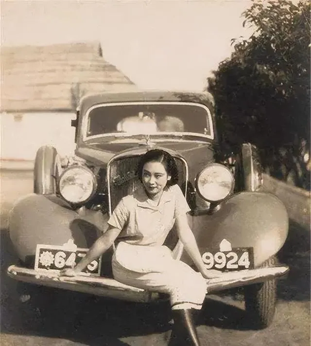 老爷车的圆灯像两只大眼睛,她坐在保险杠上,裙摆铺在铁皮上,号牌凑在镜头前,速度与优雅对峙着,那会儿开车是稀罕,照片里有点小骄傲。