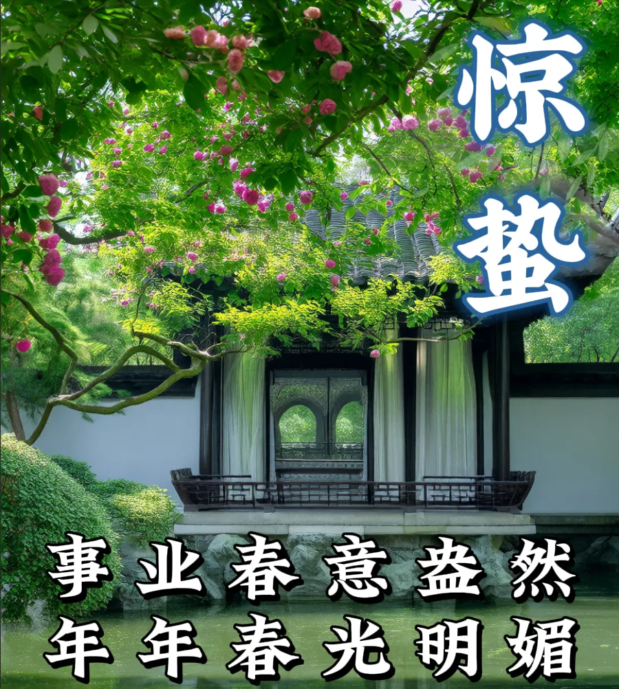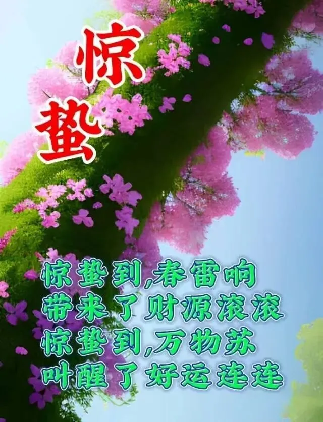 惊蛰时节送祝福,愿你生活美如画。家庭和睦事业顺,快乐幸福心飞扬。天空放晴春意浓,愿你岁岁福满堂。惊蛰时节送问候,幸福美好任你享!🎊🖼👨‍👩‍👧‍👦💼😄🎉