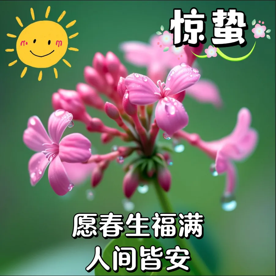 惊蛰时节,万物复苏,一切都在迎接新的开始!愿你像春风一样自由,像花朵一样灿烂,愿每一天都带给你新的惊喜和幸福!祝你惊蛰快乐,天天向上💪!🌈😄🌟🎉🌼