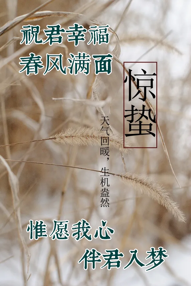 5、春雷响了,蛰伏一冬的昆虫醒了;春风暖了,寂寞一季的花儿开了。春意浓了,美好现了,笑脸灿了。惊蛰时节,满园春色关不住,愿你人生步步福!