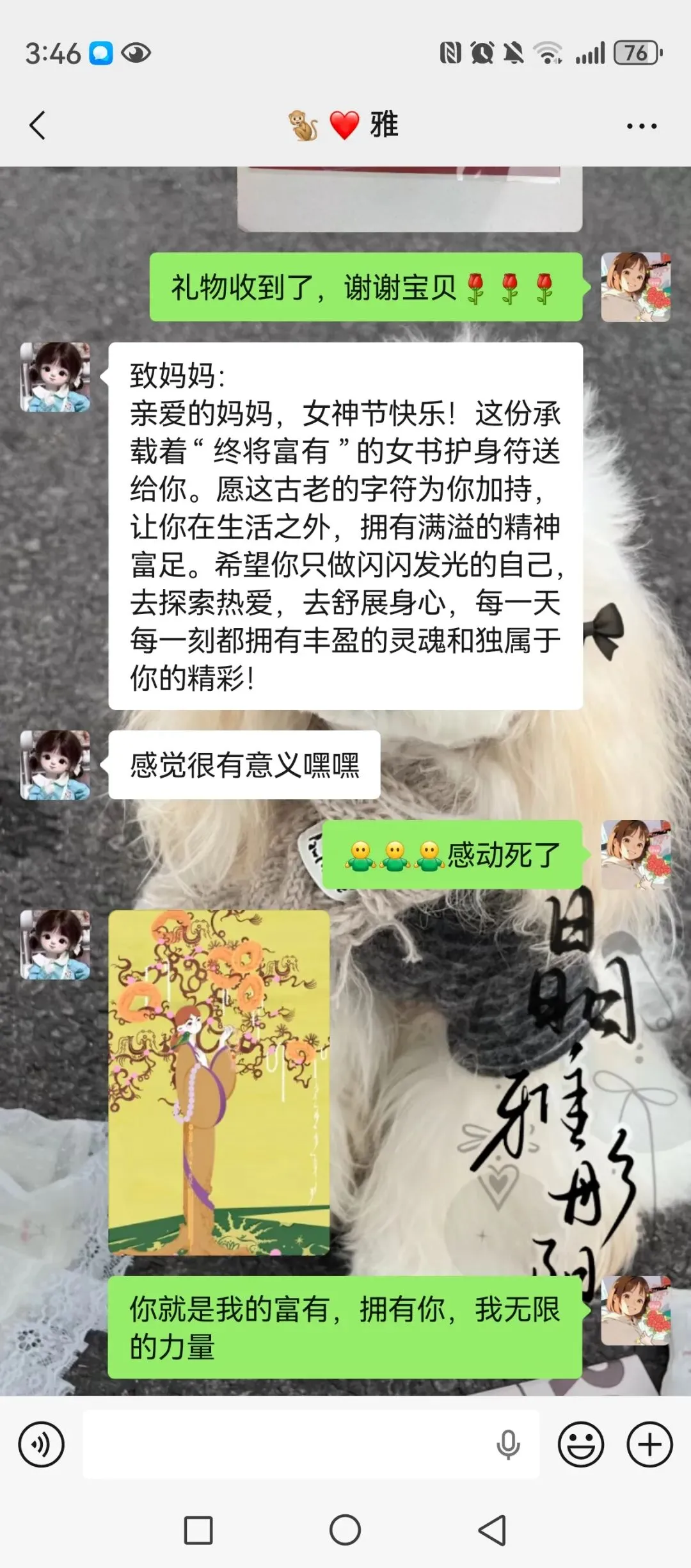 宝贝,护身符收到了,妈妈已经戴在身上了,心里暖暖的。你说要把最好的运气和平安都送给妈妈。