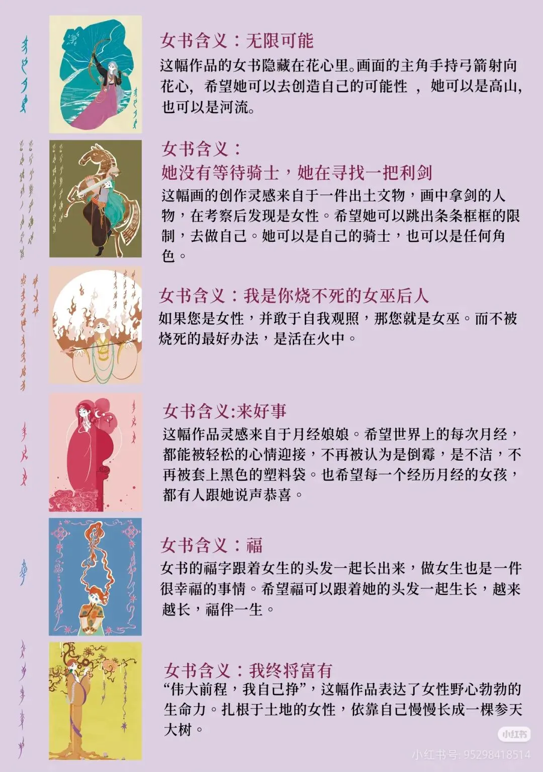 画中女主角是一位扎根于土地的女性,依靠自己的头脑、勤劳、勇敢慢慢长成参天大树。土地上的太阳和飞鸟纹样,暗示着向阳而生,活成自己的太阳。玉佩、手饰上写着女书的「智慧」。而大树下垂吊着女书文字「我终将富有」。