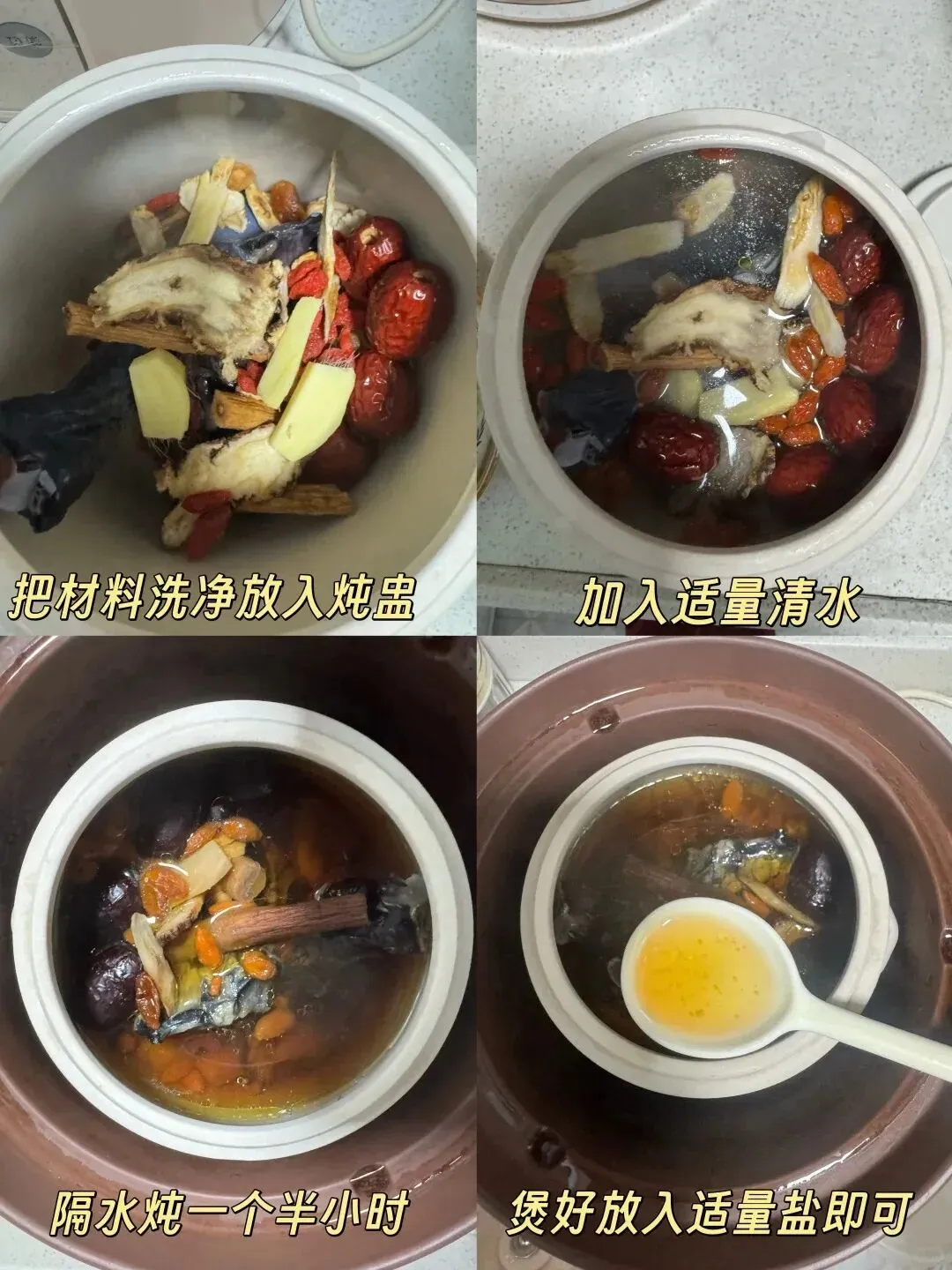 • 电炖盅:直接选择“鸡汤”或“滋补”模式,通常需 2.5 - 3 小时。