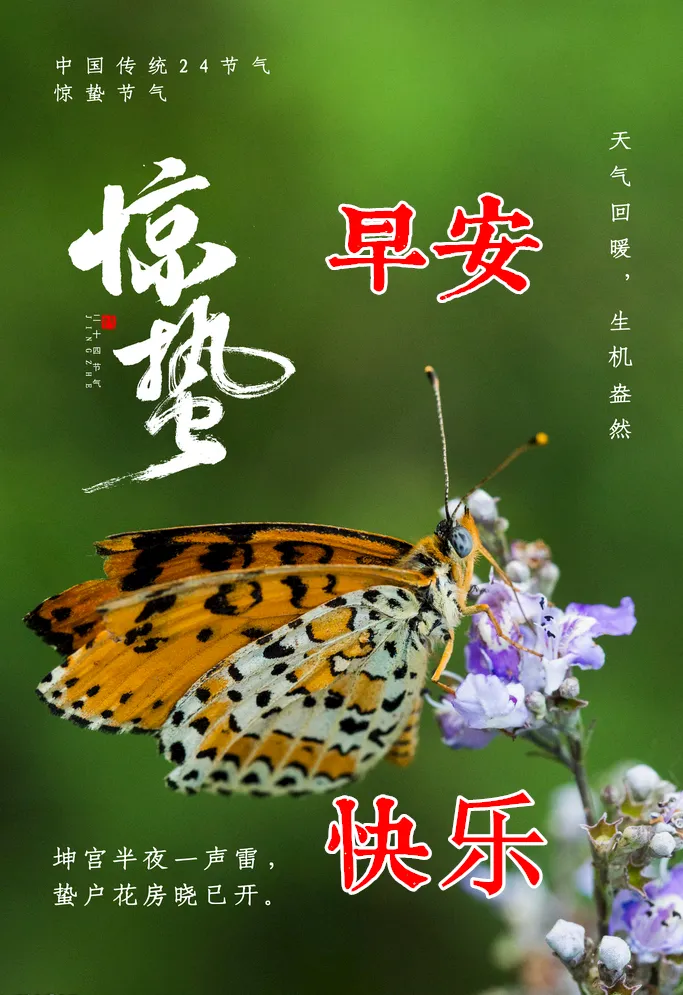 春雷的乍响是祝福是吉祥,山花的绽放是希望。桃李芬芳心飞扬,莺歌燕舞福安康,请收下我送你的惊蛰祝福,惊蛰节气快乐!