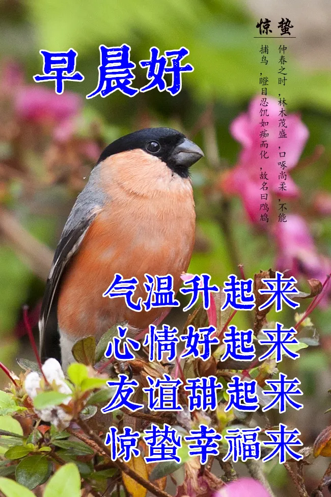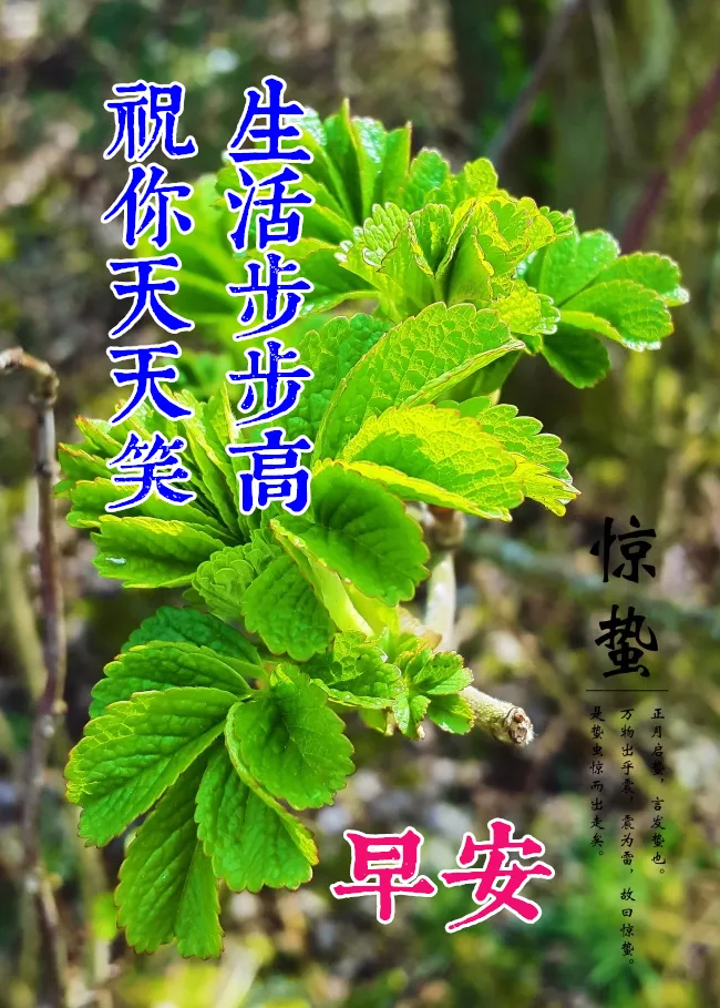 “一阵催花雨,数声惊蛰雷”。到了此时节,“数九寒天”真的结束了,春暖花开,万物复苏,正式步入“红入桃花嫩,青归柳叶新”的仲春时节。大家惊蛰早上好!