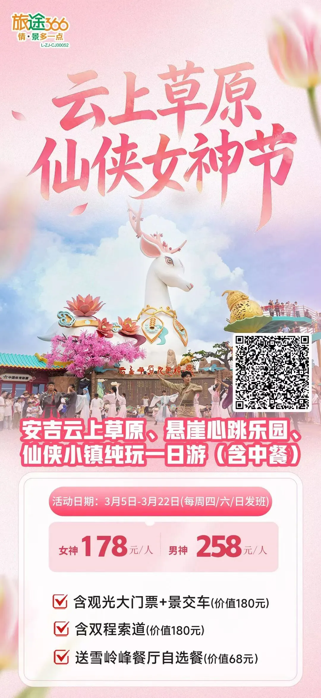 3.7号已成团出发,有余位【女神特惠节·云上一天】湖州安吉云上草原、悬崖心跳乐园、仙侠小镇一日游(含中餐)