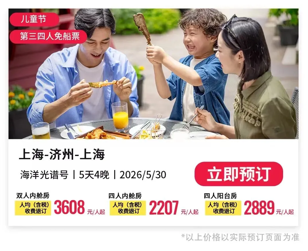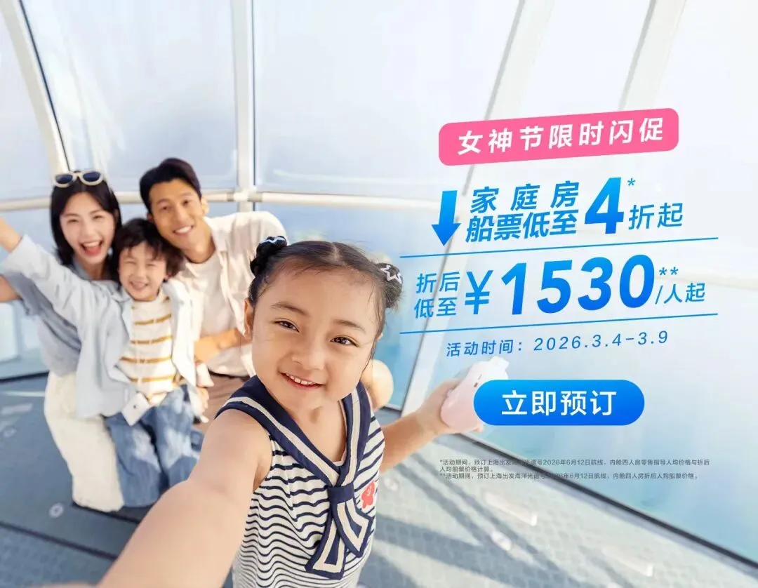 活动三:儿童节、端午航线,家庭房同舱第三、四人直接免费,人均每天500-600元,性价比直接拉满,暑期前最划算的家庭出游机会别错过!