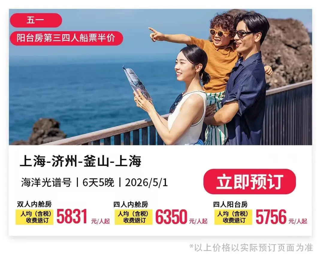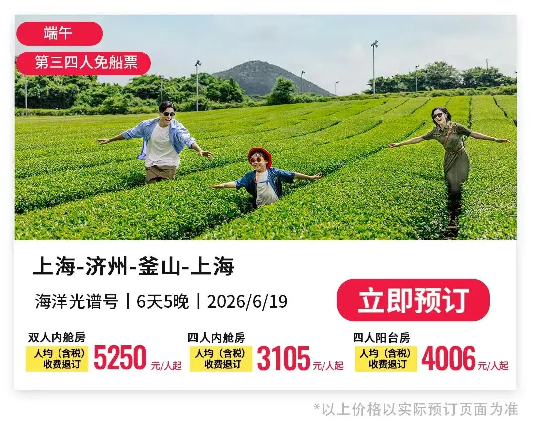 活动一:双人房船票低至5折起,以2026年6月12日上海-济州-上海航线为例,阳台四人房折后低至2308元/人,每天只需500多,内舱四人房折后更是低至1530元/人,算下来每天只需383元,还等什么,快约上闺蜜,一起登上海洋光谱号,奔赴6月的济州岛,看海、赏花、轻松度假!
