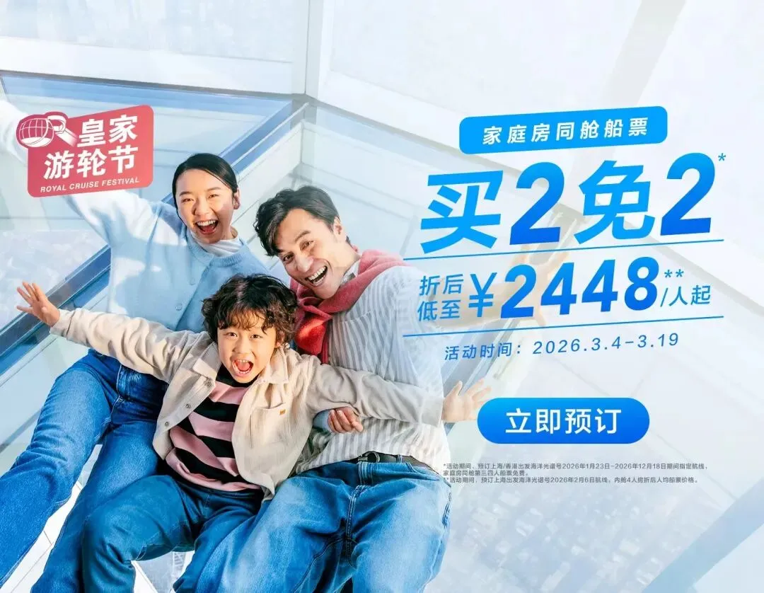 家庭房专享同舱船票买2免2,折后低至1830元/人起!