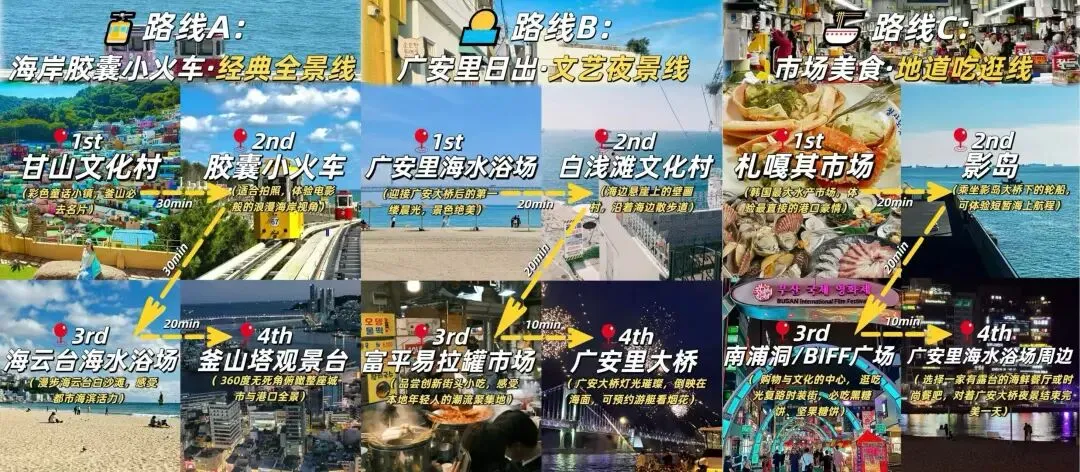 甘川文化村:被称为“釜山的圣托里尼”,五彩缤纷的房屋依山而建,巷弄间布满壁画和艺术装置。是拍照打卡的绝佳地点,也能感受到釜山的人文气息。