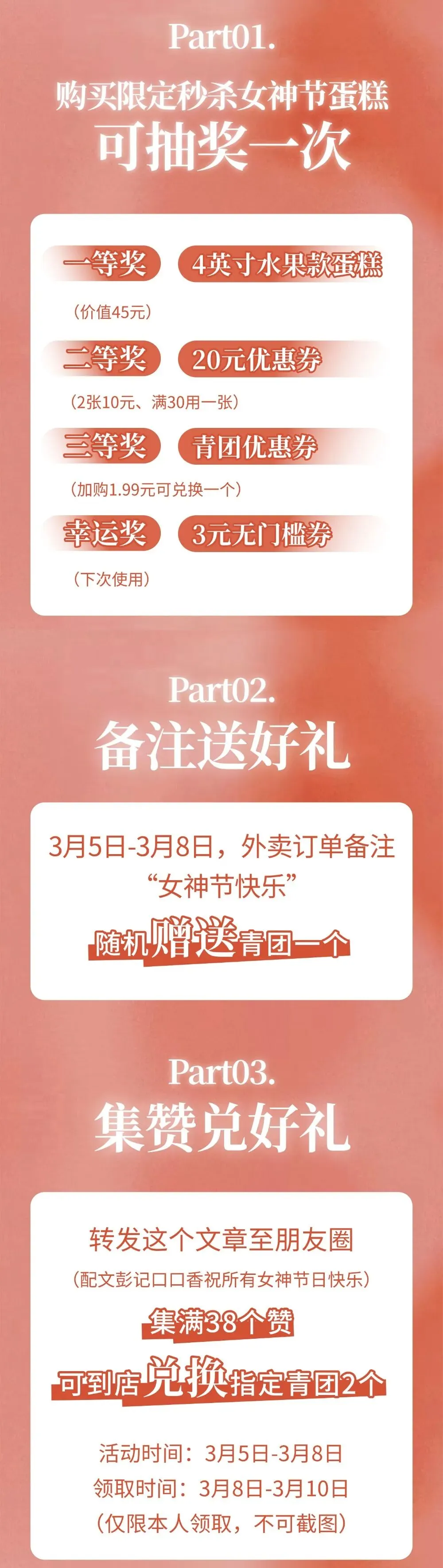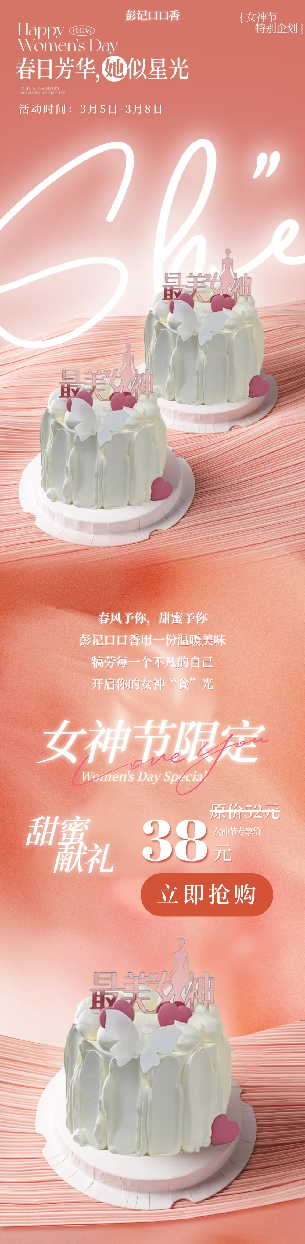 当前位置:首页>美女资讯>【1F 彭记口口香】女神节限定蛋糕秒杀,备注OR集赞青团免费吃!