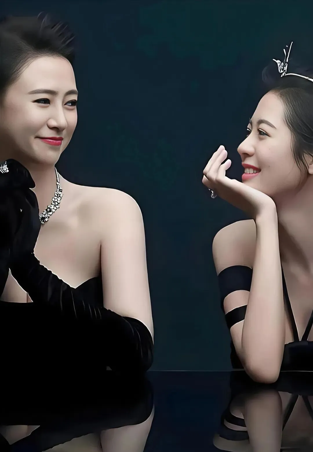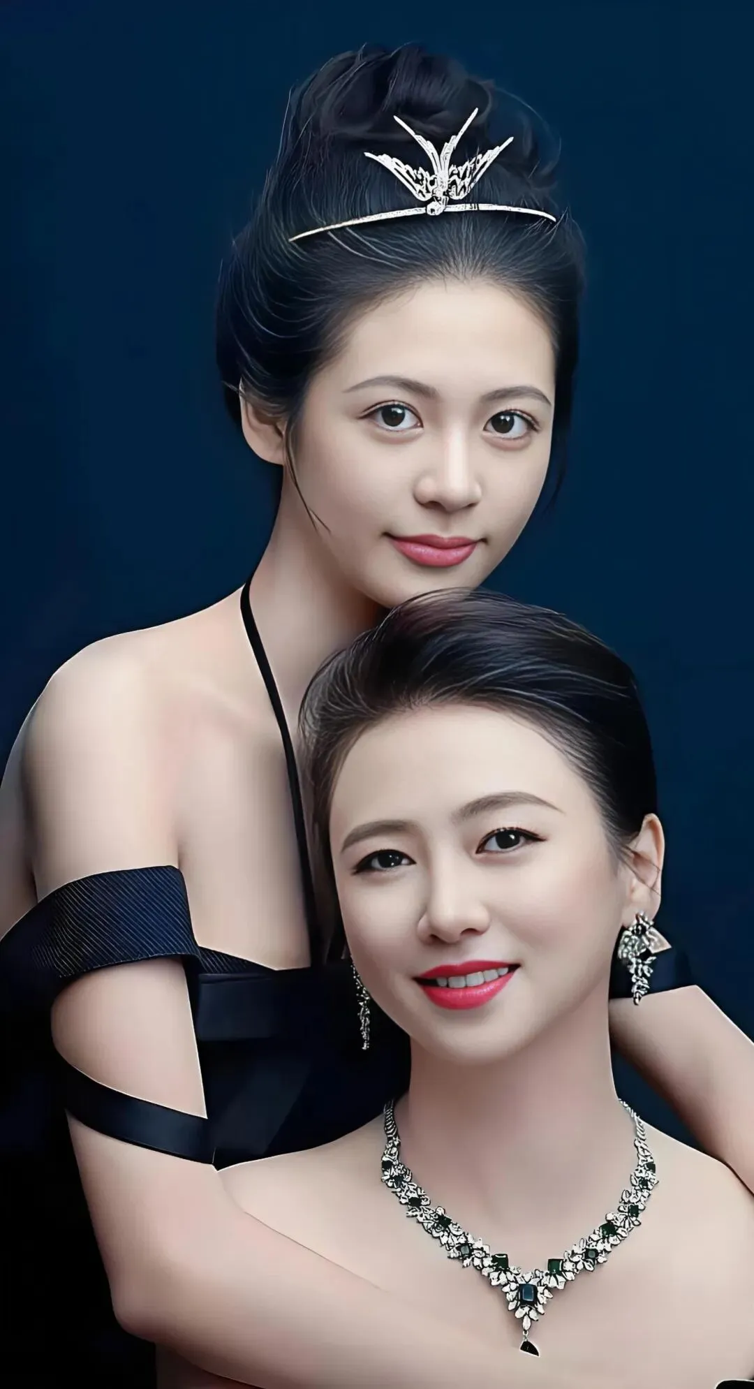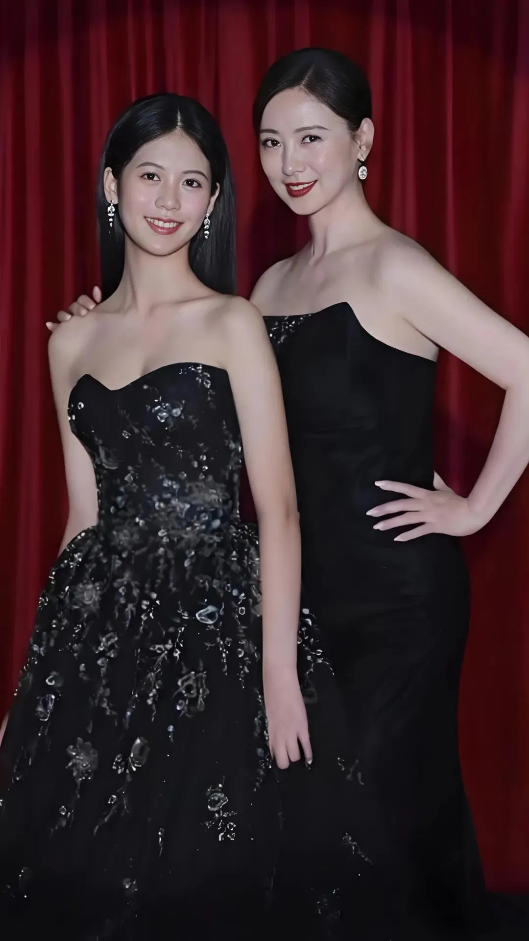 一个带着王冠像公主,一个站在身后如女王,同样的黑色礼服,却被她们穿出了截然不同的味道,一个是含苞待放的娇俏,一个是历尽千帆的从容。