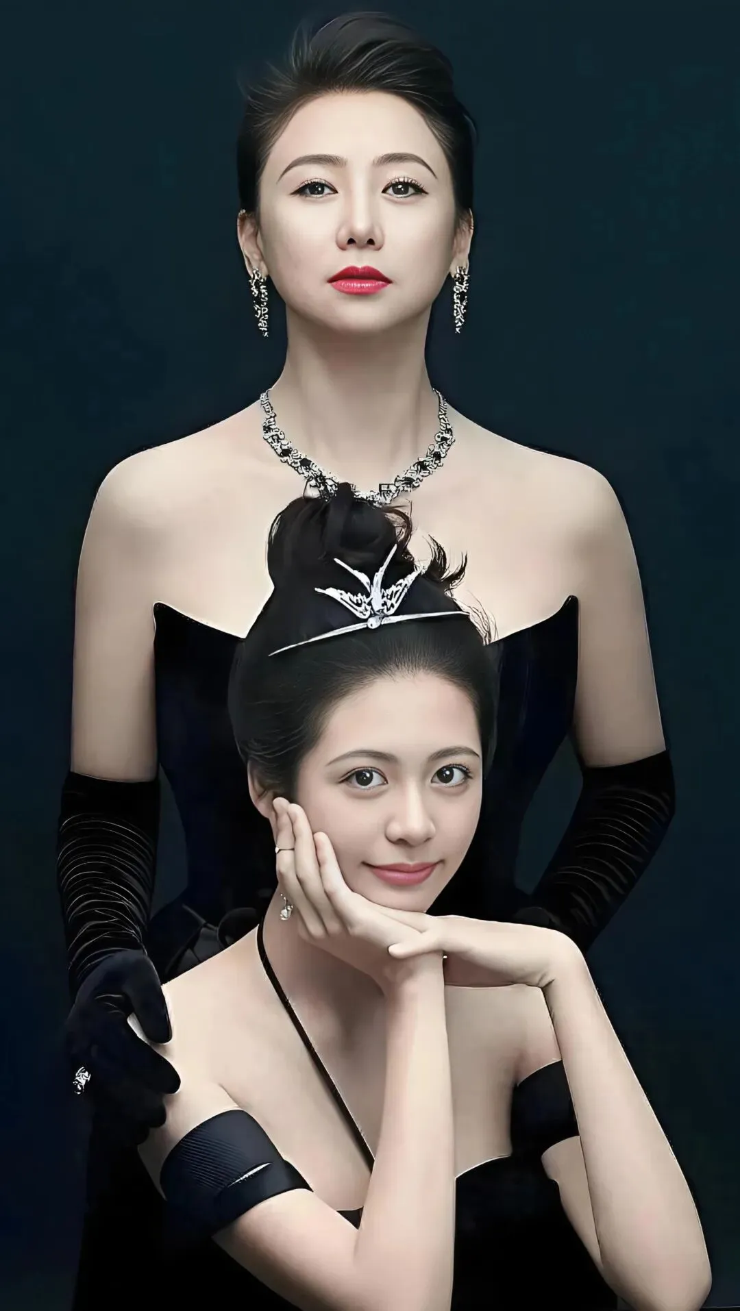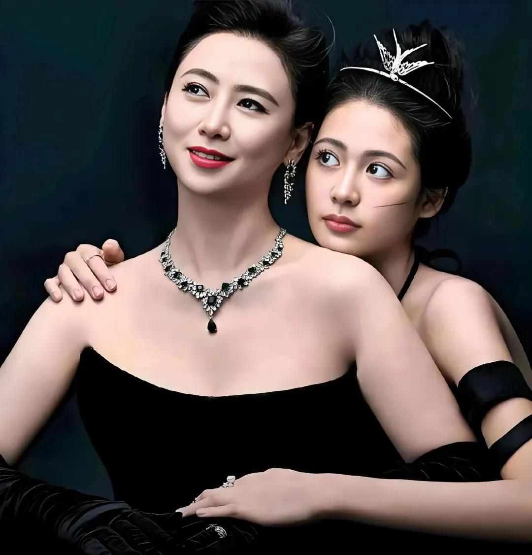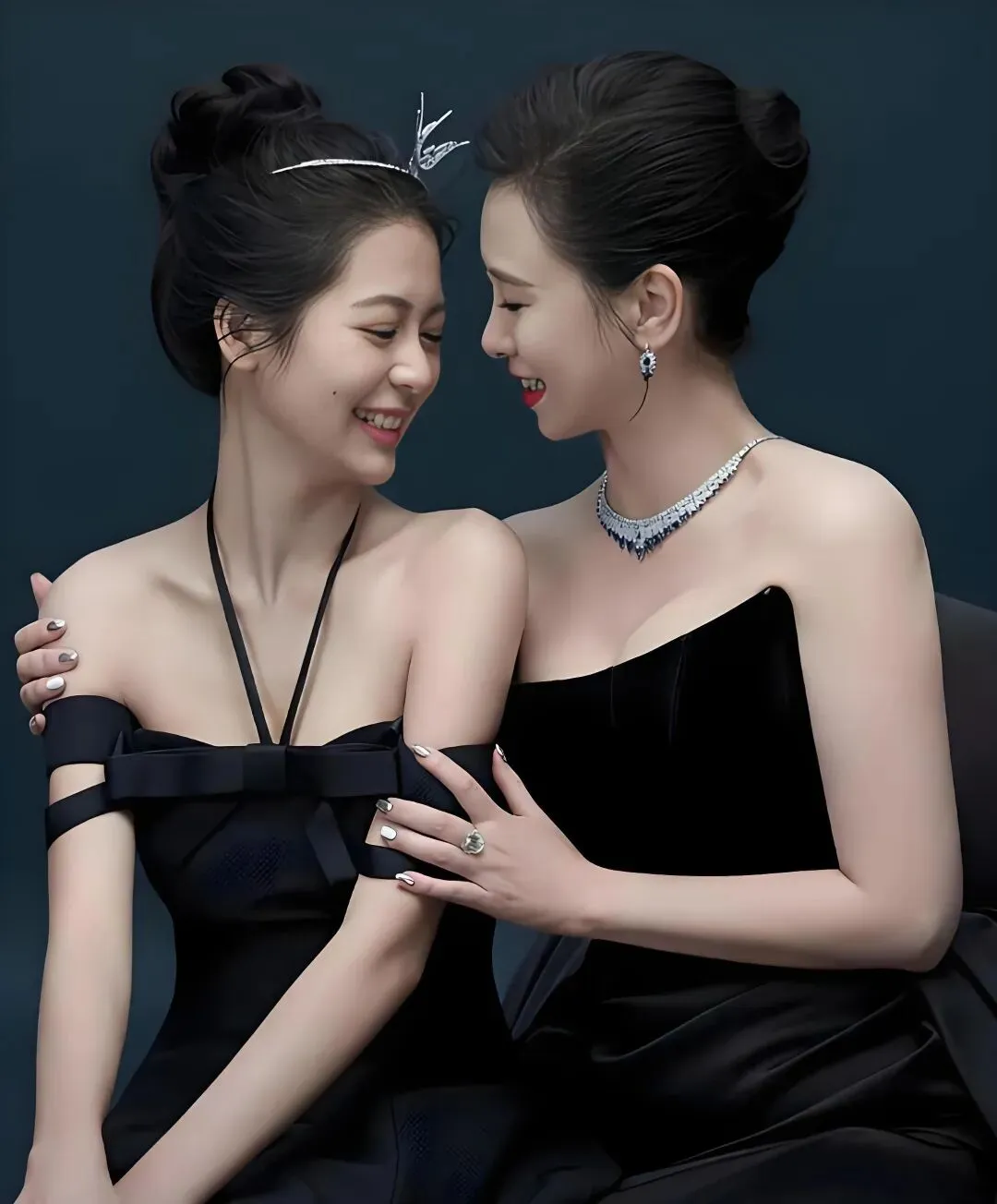 一个带着王冠像公主,一个站在身后如女王,同样的黑色礼服,却被她们穿出了截然不同的味道,一个是含苞待放的娇俏,一个是历尽千帆的从容。
