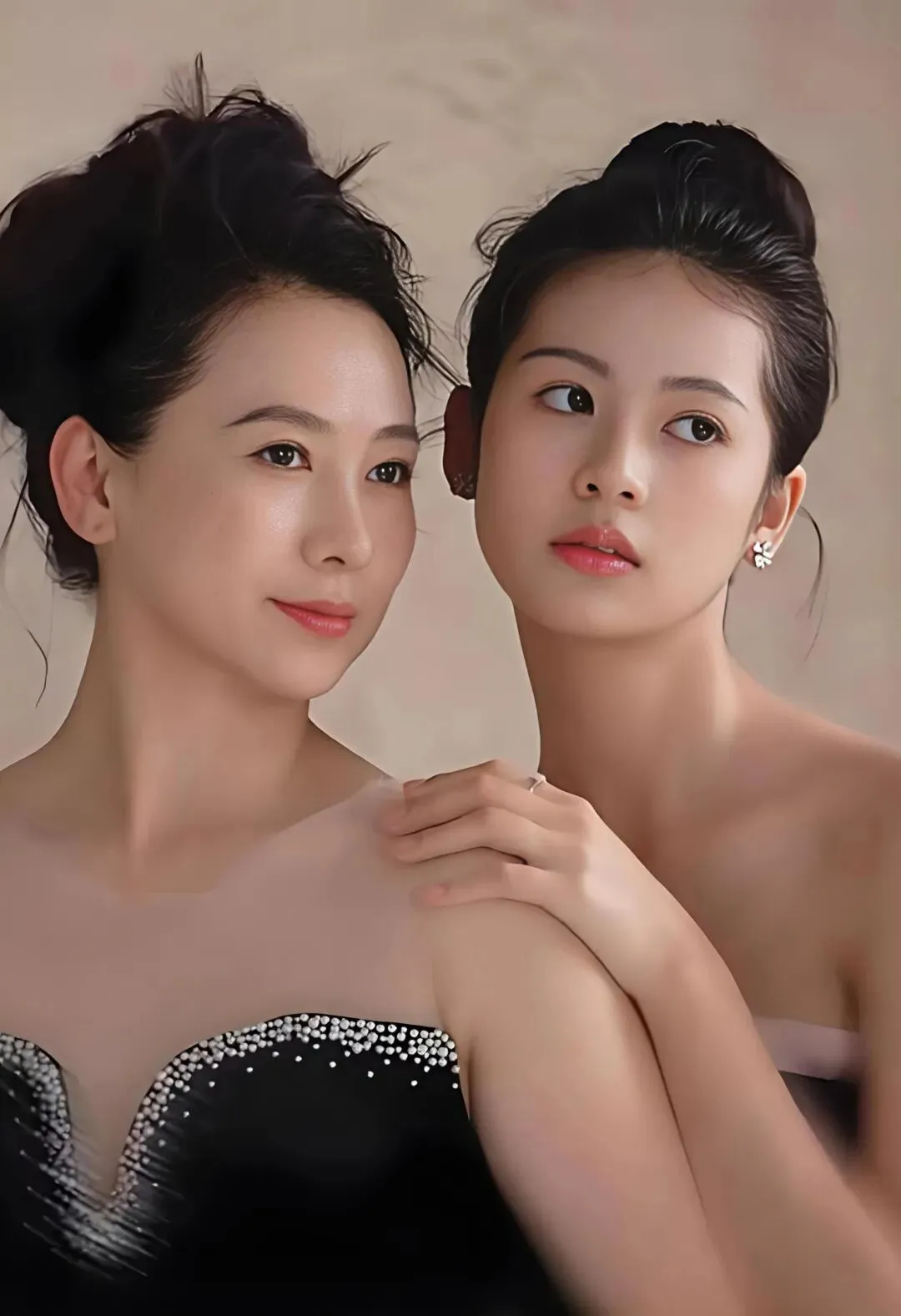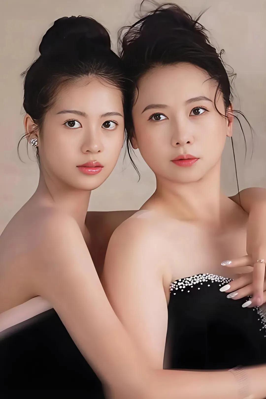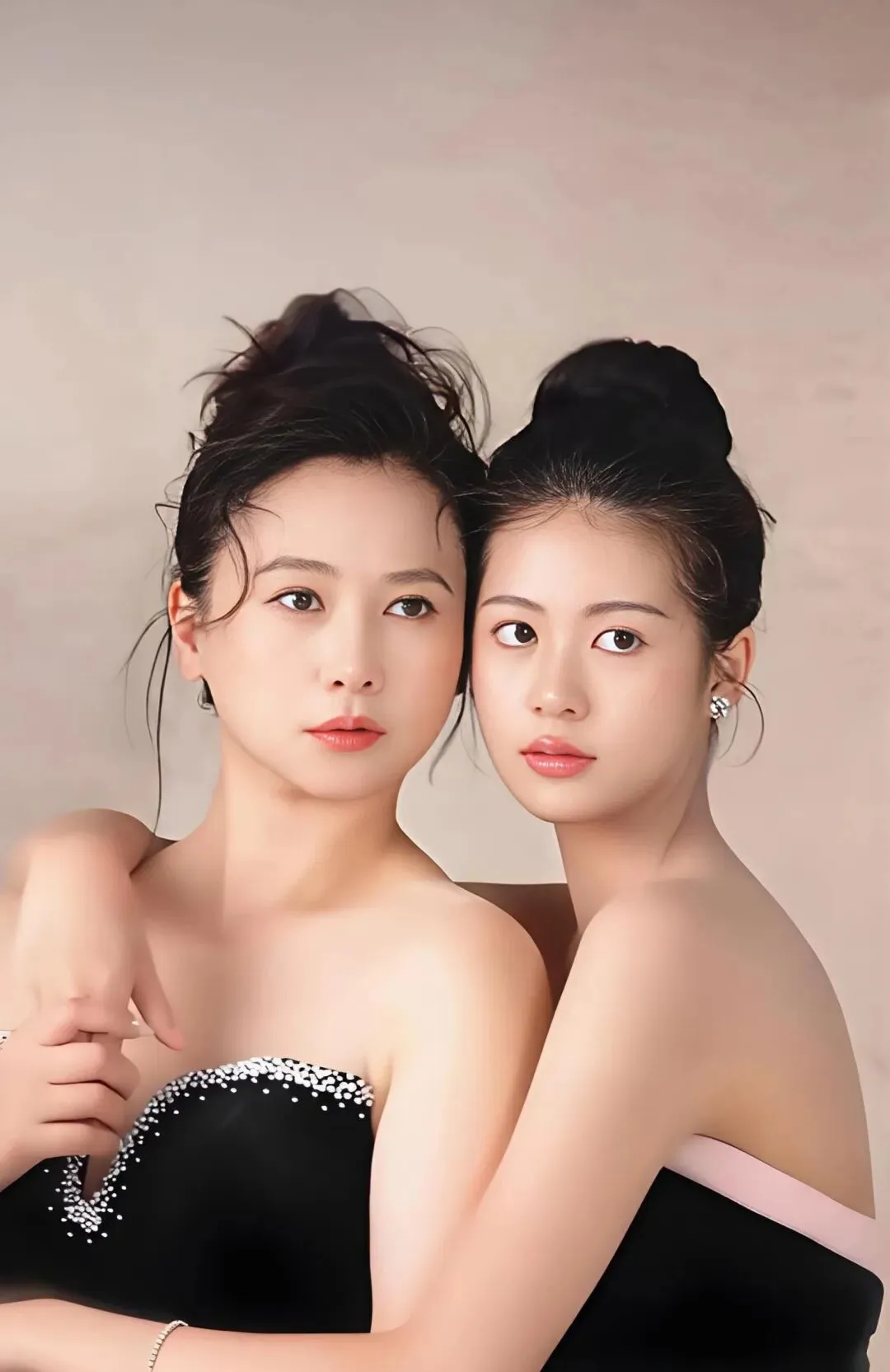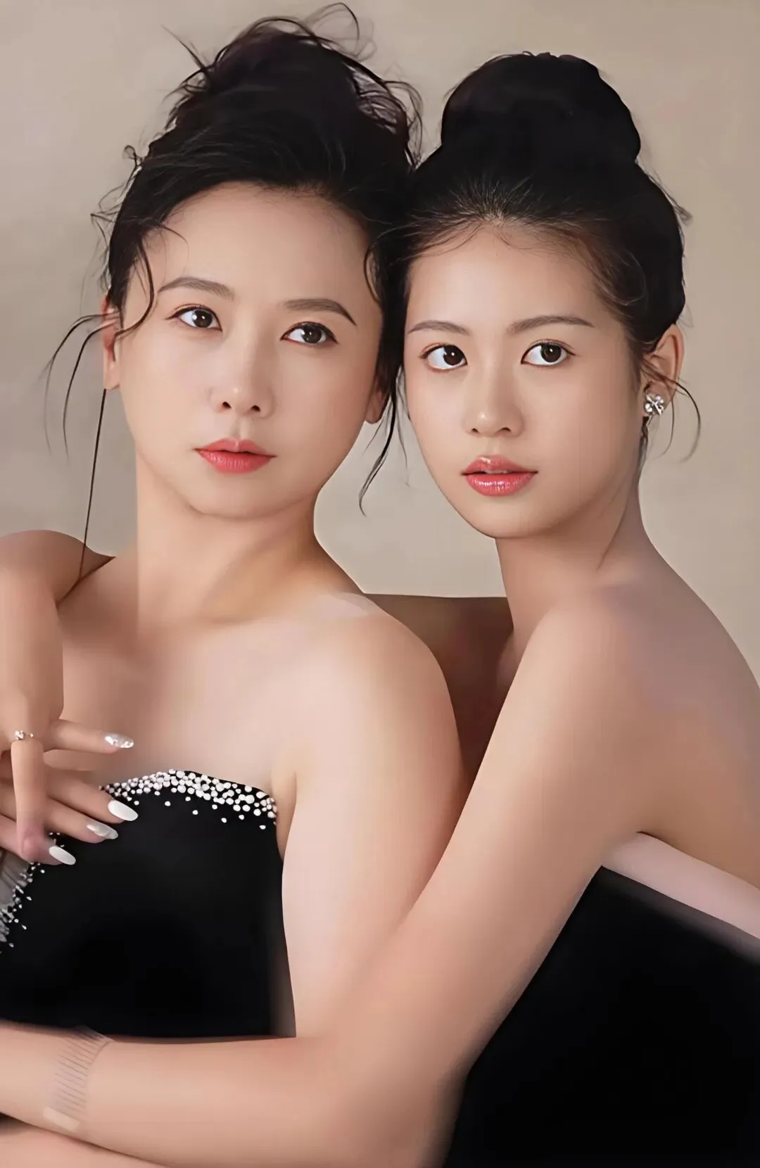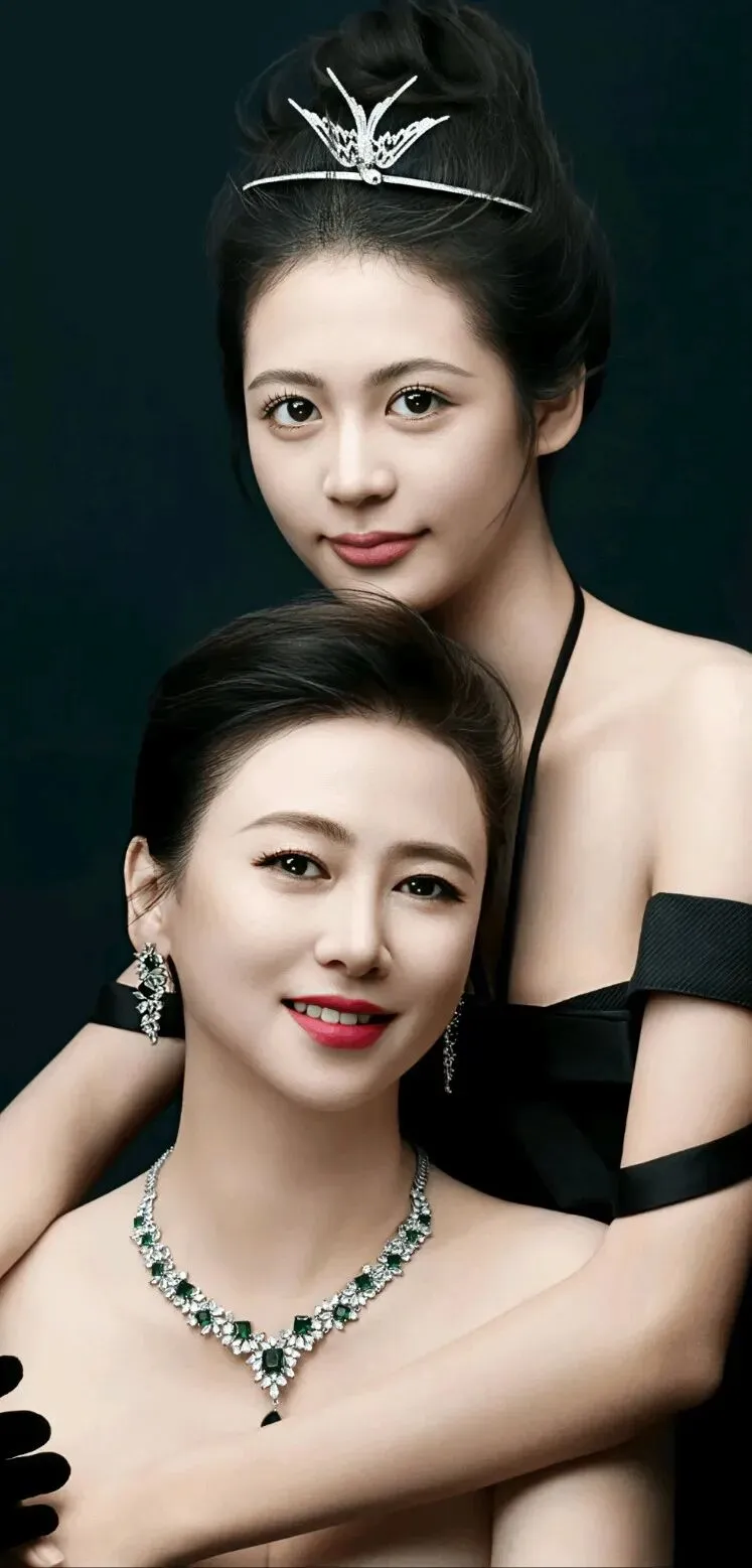而身旁17岁的小水晶,则是一朵含苞待放的花。她身穿黑色吊带礼服裙,点缀着若隐若现的亮片,精致的锁骨与优越的天鹅颈在镜头前舒展。