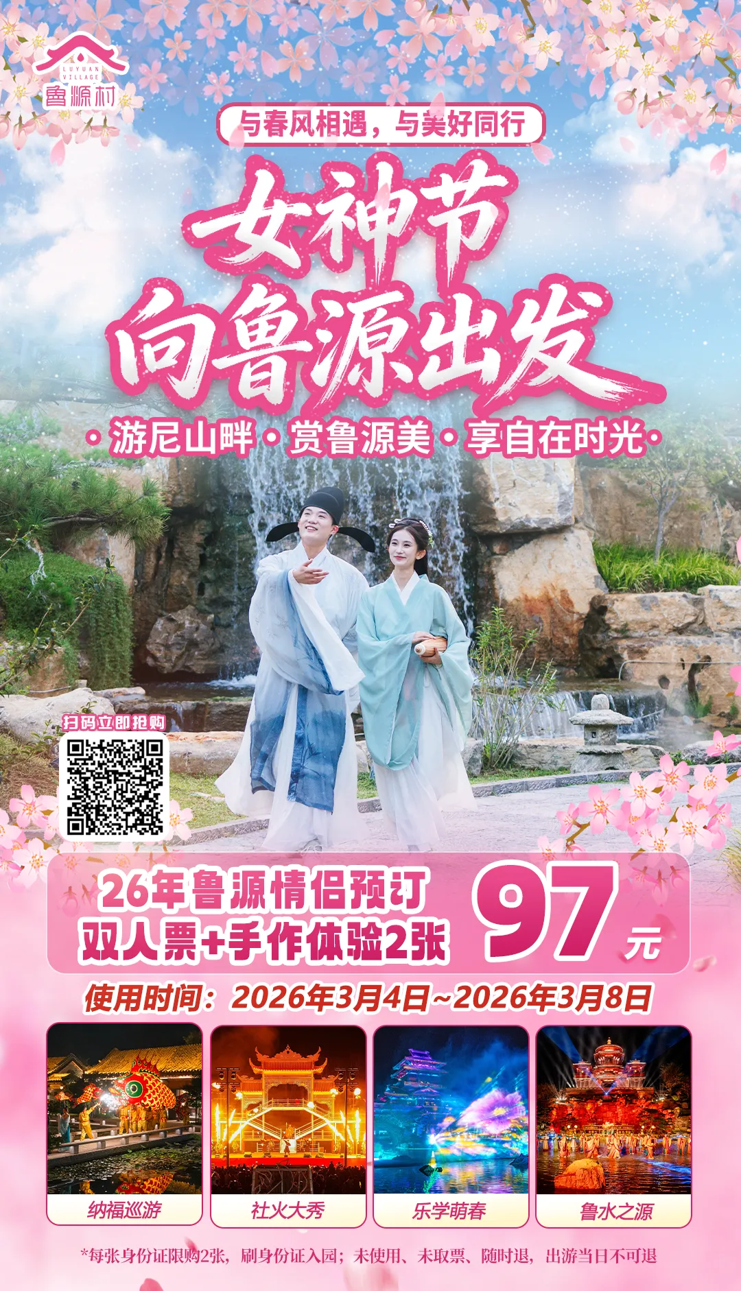 鲁源村女神节专属福利!门票+汉服体验仅需49元!南风台、尚礼阁、沂河畔……随手一拍就是朋友圈C位!更能解锁百场精彩演艺,沉浸式趣味根本玩不完,快来鲁源邂逅最美时光吧!