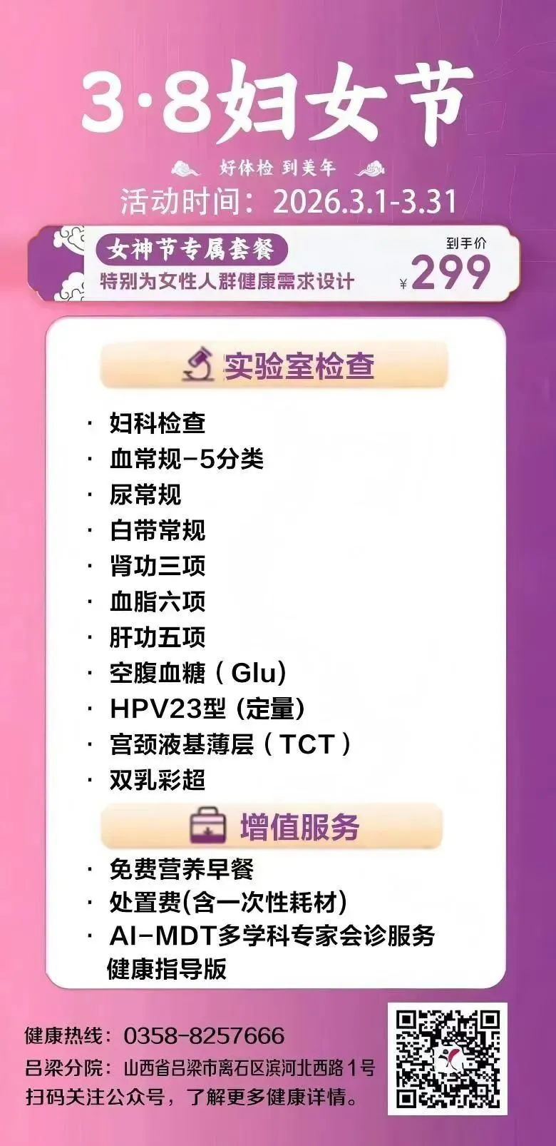 在妇女节来临之际,为关爱广大女性同胞健康,让更多的女性了解自己的身体状况,吕梁美年综合门诊部推出女性专项体检套餐活动,全方位呵护女性健康,送给勤劳美丽的女性朋友们一份温暖贴心的礼物!