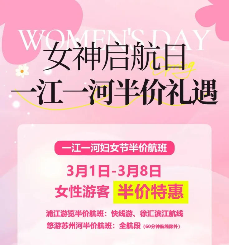 悠游苏州河特意为各位女神准备了一份诚意满满的节日惊喜——「女神启航日」半价礼遇!让蜿蜒的河水和两岸的春光,为您献上最美好的祝福。