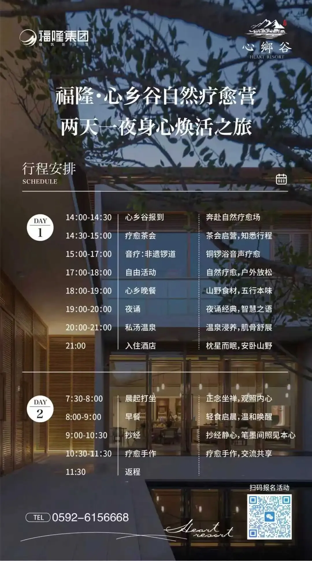 从非遗锣道的音声疗愈,到私汤温泉的肌骨舒展;从晨起打坐的正念观心,到抄经静心的笔墨修行。在两天一夜的深度疗愈中,与自己温柔重逢。