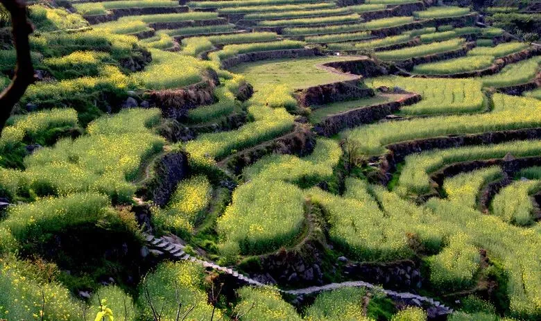以前山民为了生存,在海拔500米左右的山腰上,开垦出23000块大小不等的梯田,约2300多亩。梯田全部由第四纪冰川遗迹的岩块砌筑而成。