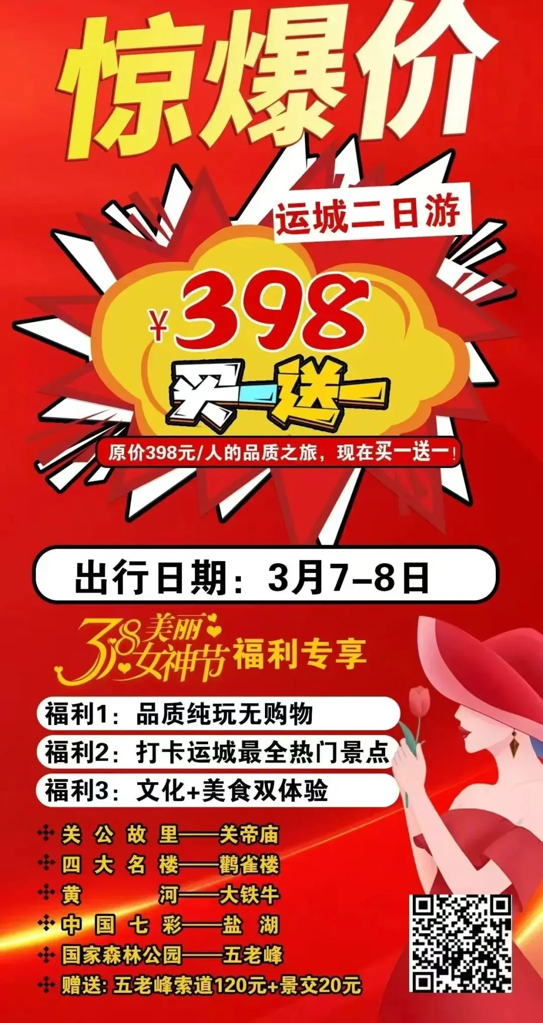 🔥原价368元/人的品质之旅,现在买一送一!3月7-8日,专为女神定制的福利专列🎁