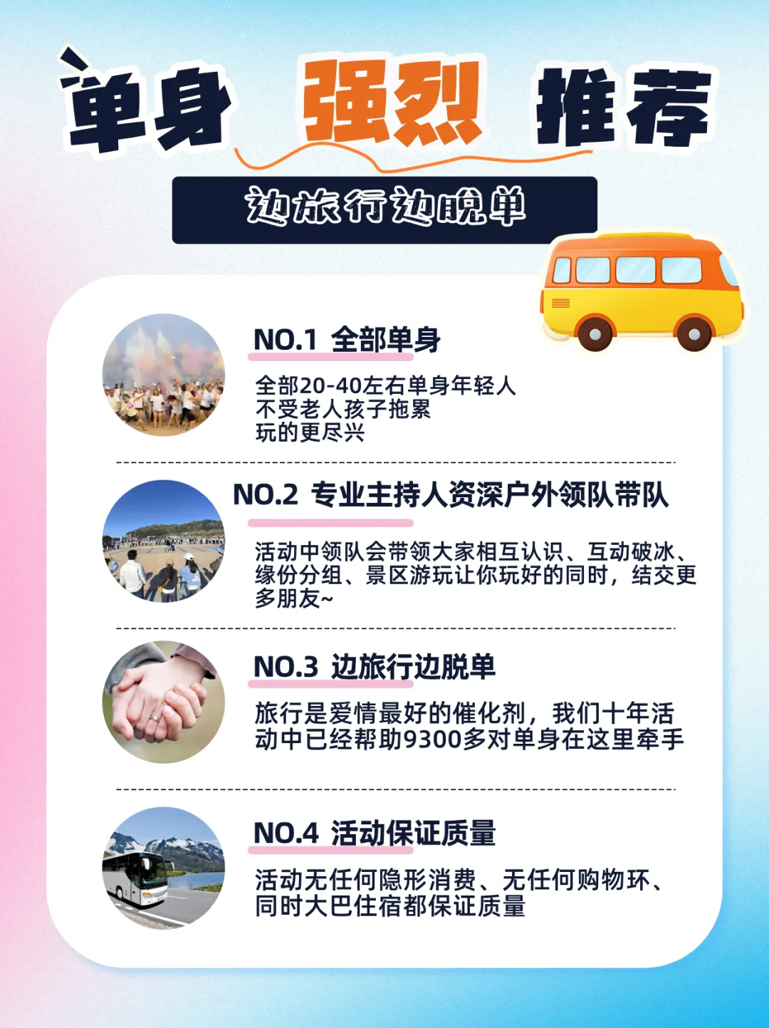 - 缘分是奇妙的引线,按缘分值分配座位,男女间隔而坐,开启初遇的心跳。专业领队化身“破冰大师”,组织大家在大巴上进行自我介绍,让初次见面的尴尬瞬间消散。请严格按照集合信息准时出发。