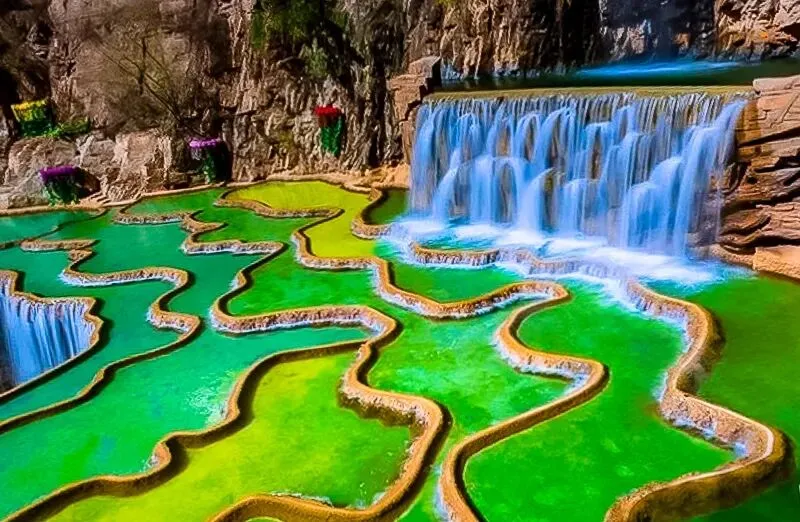 七彩池是由大大小小的水池组成,所有的池水来自同一条瀑布,水流到各个水池里,颜色却不同了。池边由金黄色的石粉凝结而成,像一圈圈彩带,把大大小小的水地围成各种不同的形状,有像葫芦的,有镰刀的,有像月牙的,有像盘子的,有像莲花的……