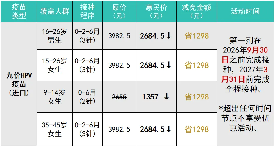 *九价优惠针次免除疫苗费用,仅收取接种服务费及冷链储运费29.5元/剂。