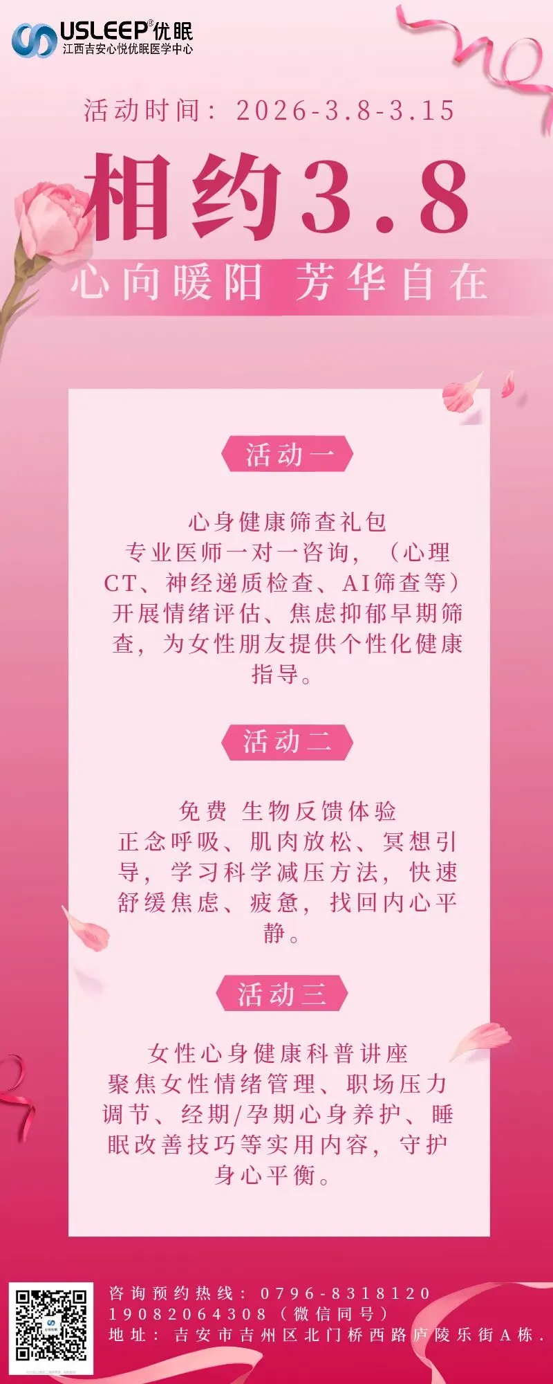 春风和煦,芳华绽放。在第116个三八国际妇女节来临之际,为关爱女性身心健康,缓解职场压力、情绪焦虑、睡眠困扰等问题,吉安心悦优眠心理咨询中心特举办“心向暖阳,芳华自在”女神节专属暖心活动,以专业守护、温柔陪伴,致敬每一位努力生活的女性。