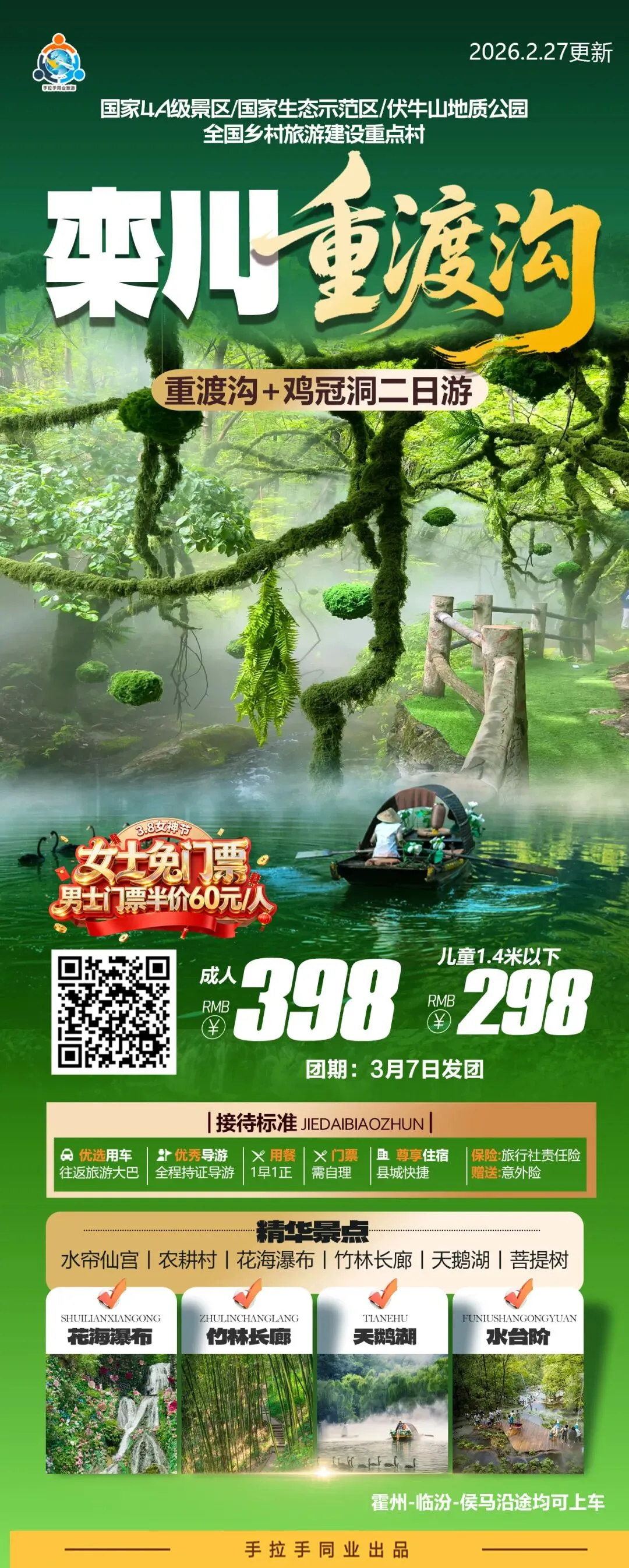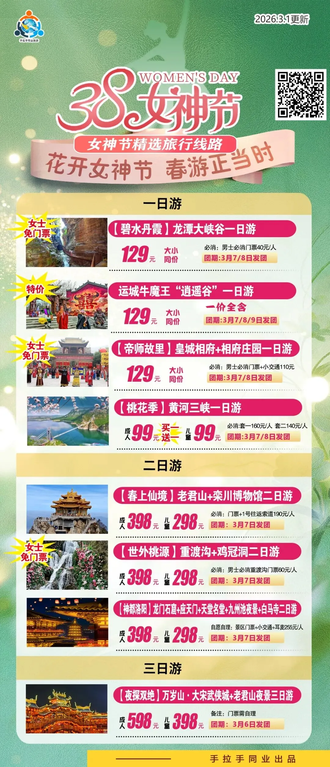 这一次,我们精心准备了多条专属路线,从一日漫游到三日深度体验,只为让您的旅途充满惊喜与惬意。3月6日、7日、8日,多团期出发,更有女士专属免票、特价等暖心福利!快来看看哪一份心动,正等着与您相遇。