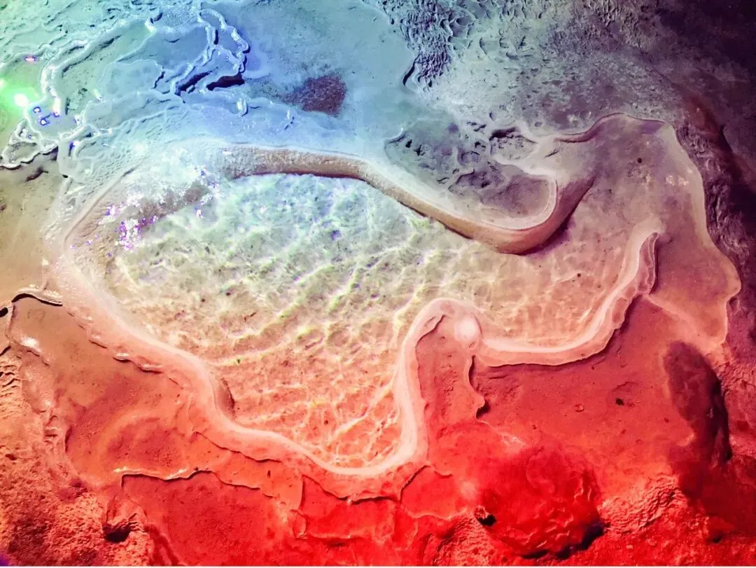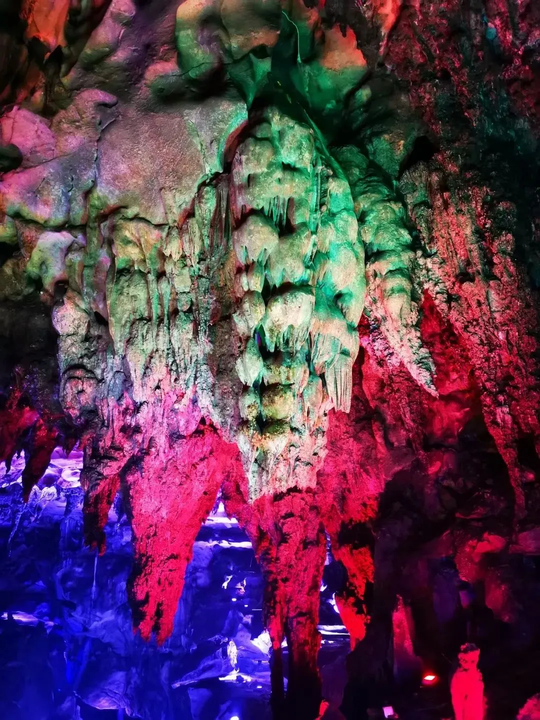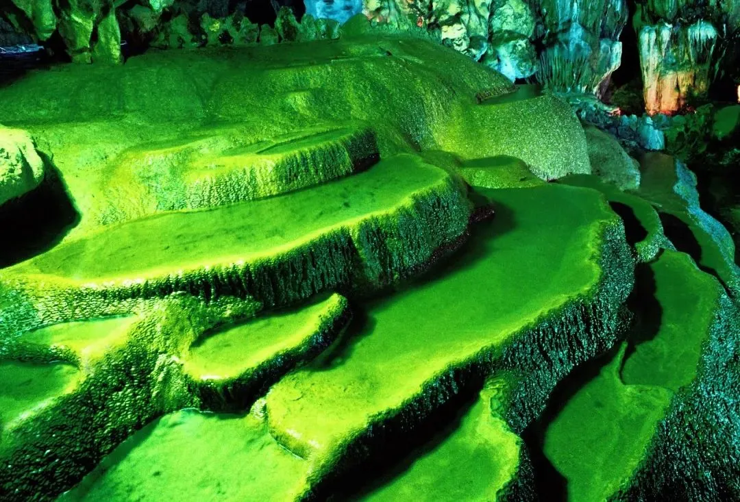整个空间都充满了琳琅满目、色彩斑斓的石钟乳、石笋、石幔、石帘、石瀑布、石帘花等