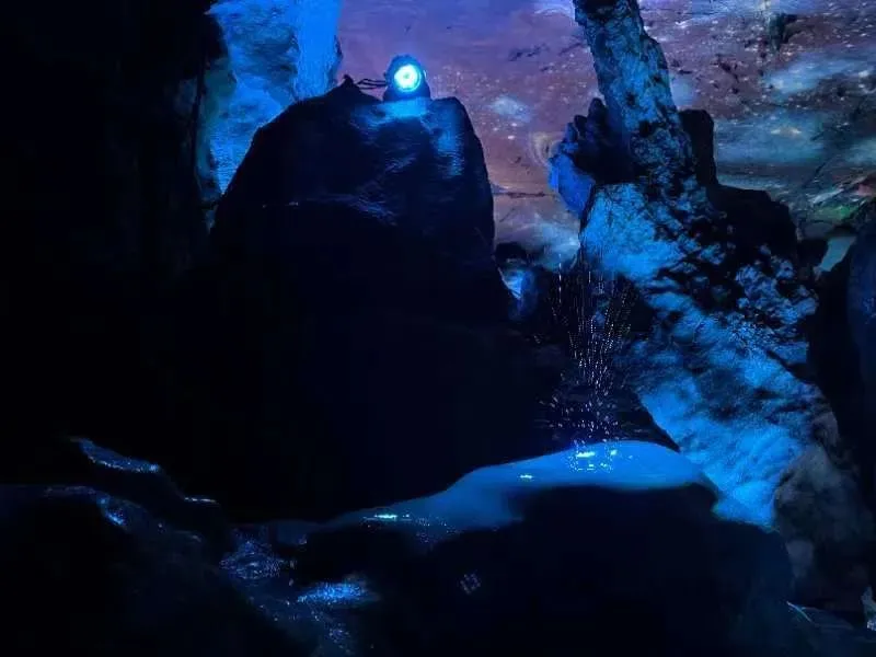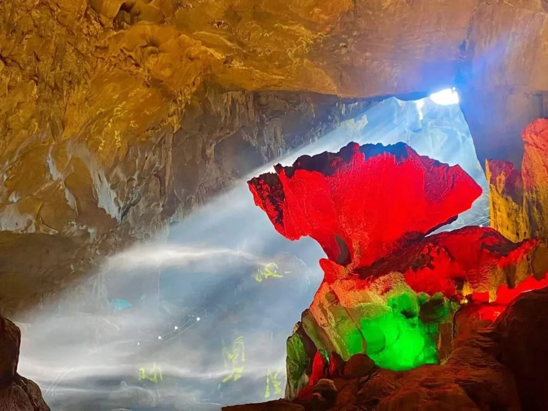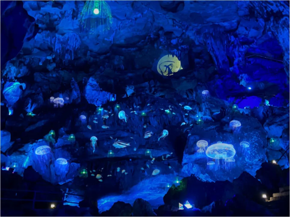 在2020年年底玉华洞景区开启灯光提升改造项目,省旅发集团总投资1100万元,在黄泥洞展示了全国首创沉浸式溶洞5D穹幕光影秀《大闹天宫》以西游记孙悟空原型作为创作蓝本,利用现代全息投影技术、结合声光电等融合多种特效技术表现形式,打造出震撼的沉浸式5D视觉体验。