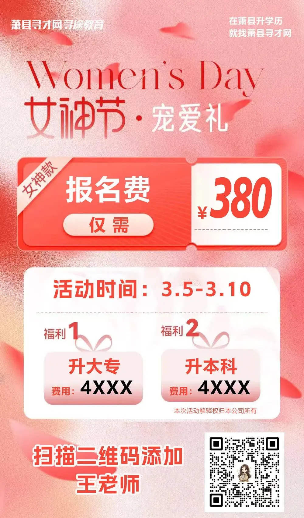 当前位置:首页>美女资讯>“三八·女神节”活动!在萧县仅380元即可报名大专本科提升学历,别错过→