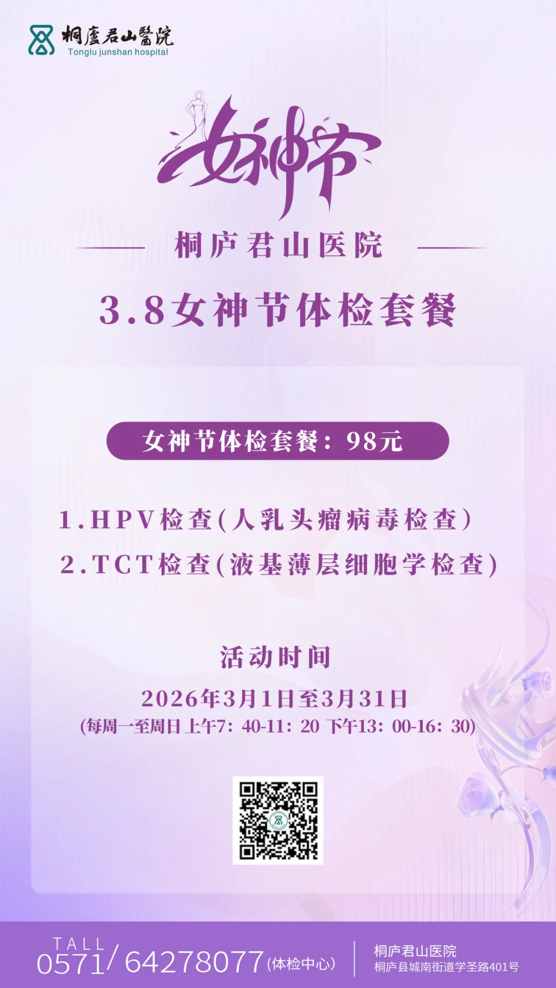 爱他人,更要爱自己。女性的健康,从来都不是孤军奋战,而是需要专业的守护与细致的关怀。桐庐君山医院始终心系广大女性健康,值此女神节来临之际,特推出HPV+TCT宫颈筛查专属优惠套餐,以专业医疗之力,为每一位女神筑牢健康防线,送上最实在的节日厚礼!