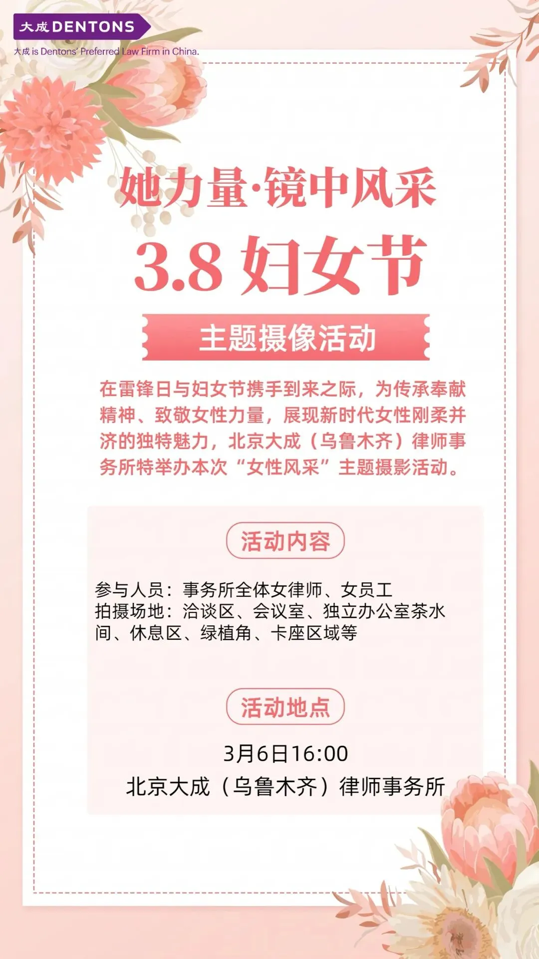 当前位置:首页>美女资讯>大成活动丨光影敬巾帼,法暖女神节 专属拍摄+公益法律咨询,双份美好邀您参与