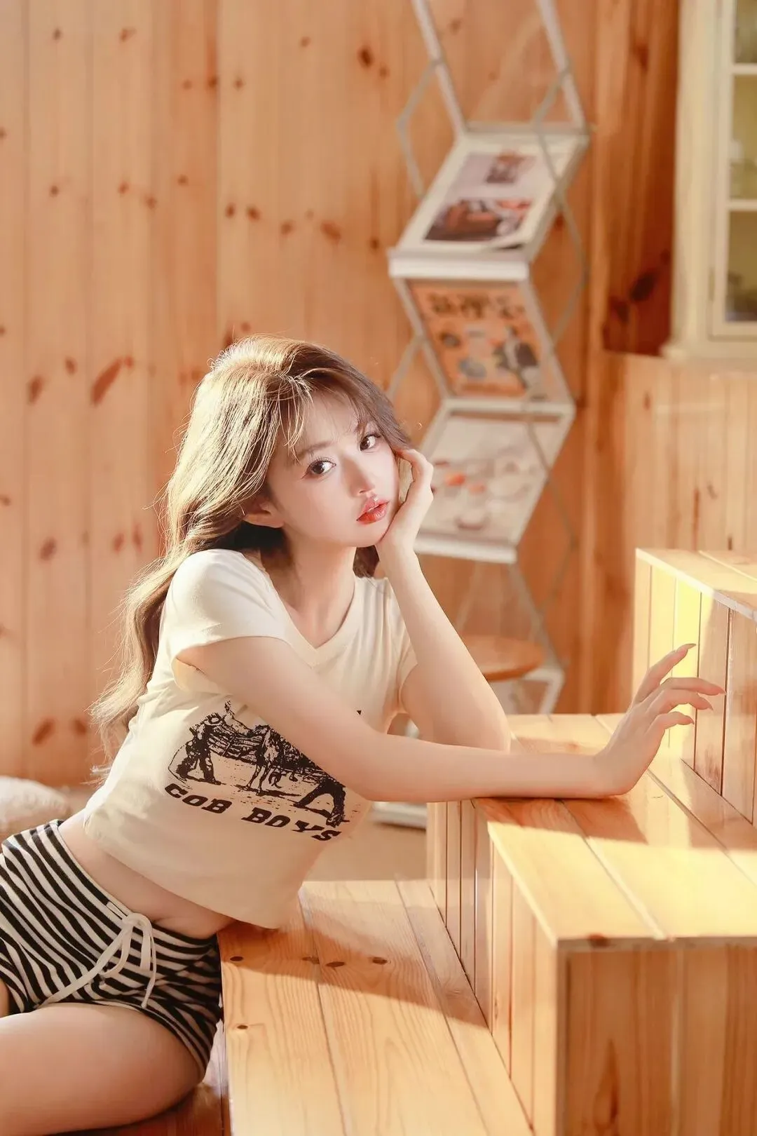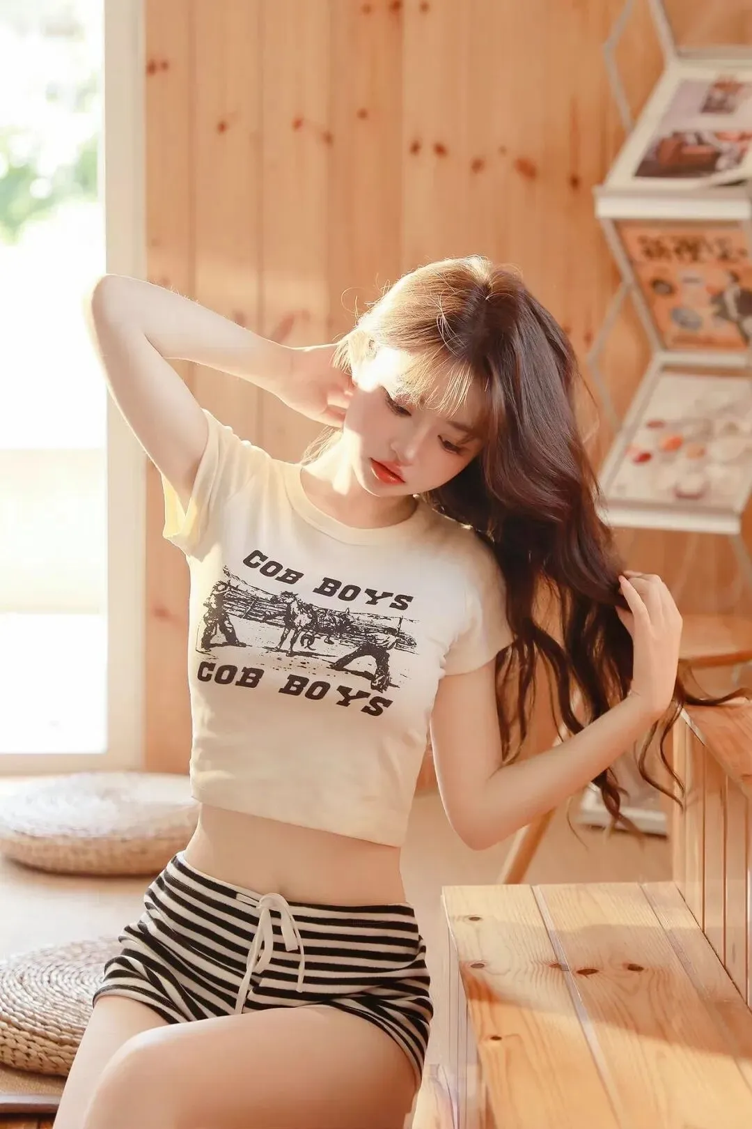 📷暖调木屋里藏着慵懒午后,米白短款T恤印着复古字母,随性又带点美式甜酷感,刚好露出腰线。黑白条纹短裤利落清爽,松紧腰设计藏住小肉肉,软乎乎的面料裹着松弛感,不用刻意打扮,就把居家氛围感拉满,舒服又上镜。