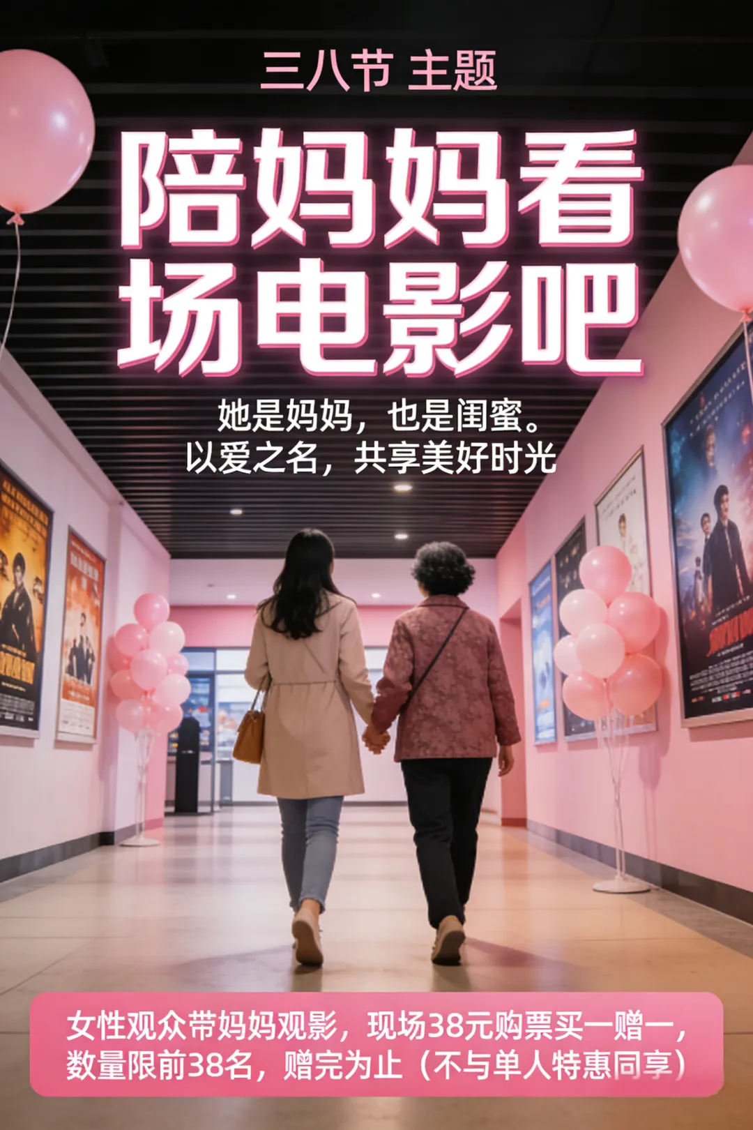 三八节,陪妈妈看场电影吧,她是妈妈,也是闺蜜。以爱之名,共享美好时光。女性观众带妈妈观影,现场38元购票买一赠一。