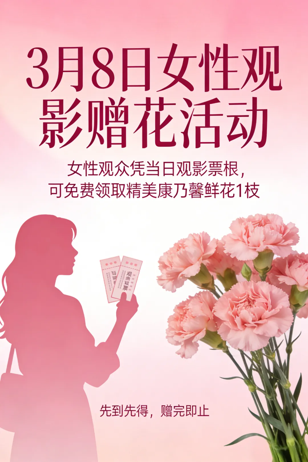 38日当天,女性观众凭当日观影票根,可免费领取精美康乃馨鲜花1