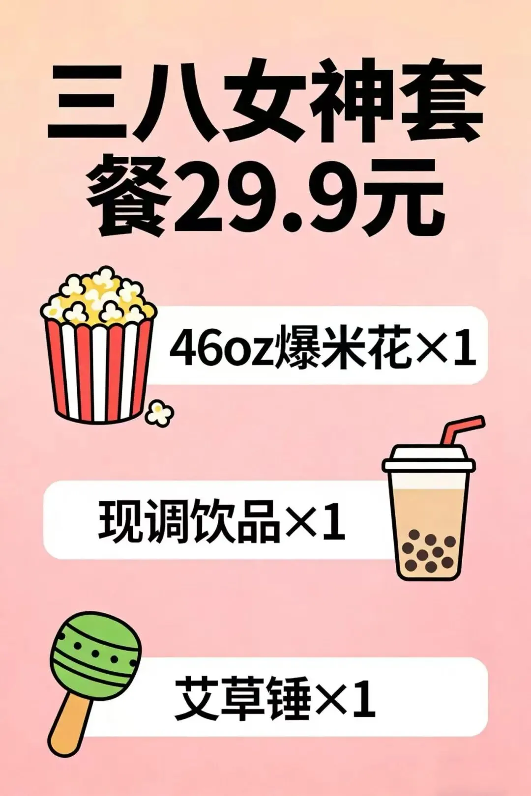 女神套餐29.9元:含46oz爆米花*1+现调可乐*1+ 3.8节女神专属礼品。
