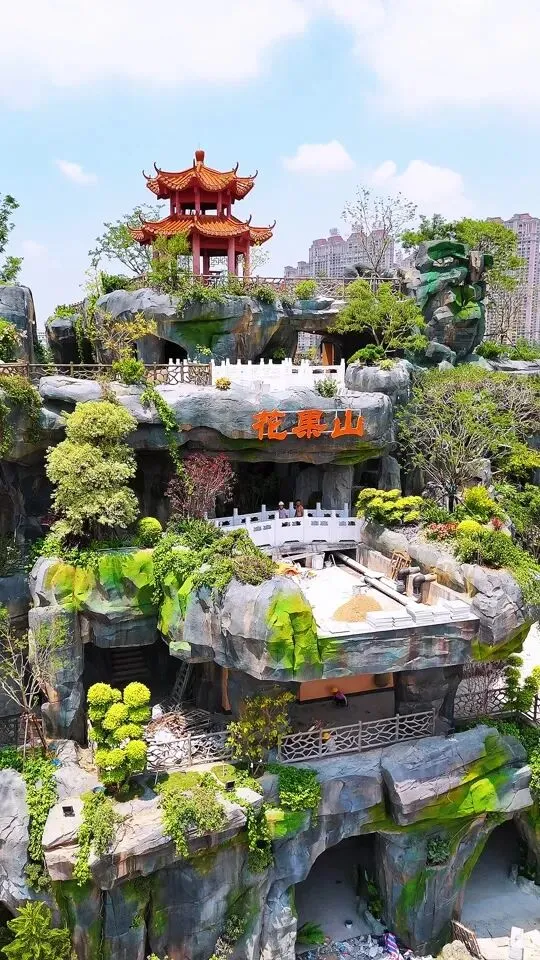 桥北区聚焦文化体验与市井烟火。花果山(外观,门票自理)以《西游记》神话场景打造沉浸式游园,步行街汇聚66间商铺,潮州美食、陶瓷精品、文创市集等应有尽有。桥南区则主打生态科技与休闲娱乐,植物迷宫曲径通幽,水晶楼光影交错,儿童乐园与长者休闲区满足全年龄段的需求。