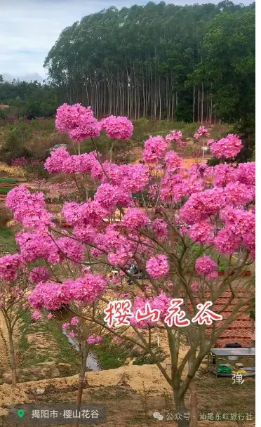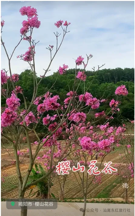 午餐后乘车前往揭西【樱山花谷景区】踏青赏花位于揭西县京溪园镇曾大寮浦池村,是粤东首个以樱花为主题的特色乡村休闲旅游项目。一踏进园区,刻着“樱山花谷”四个每年三四月份是樱花绽放的时节。在樱山花谷景区里,4000多株不同品种的樱花娇艳绽放,数百株10米巨树樱红灿烂,甚是美丽!