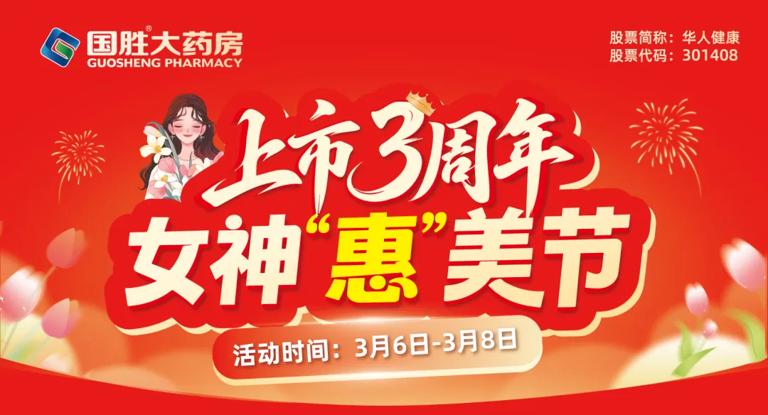 当前位置:首页>美女资讯>国胜大药房 上市3周年 女神“惠”美节 活动时间:3月6-8日
