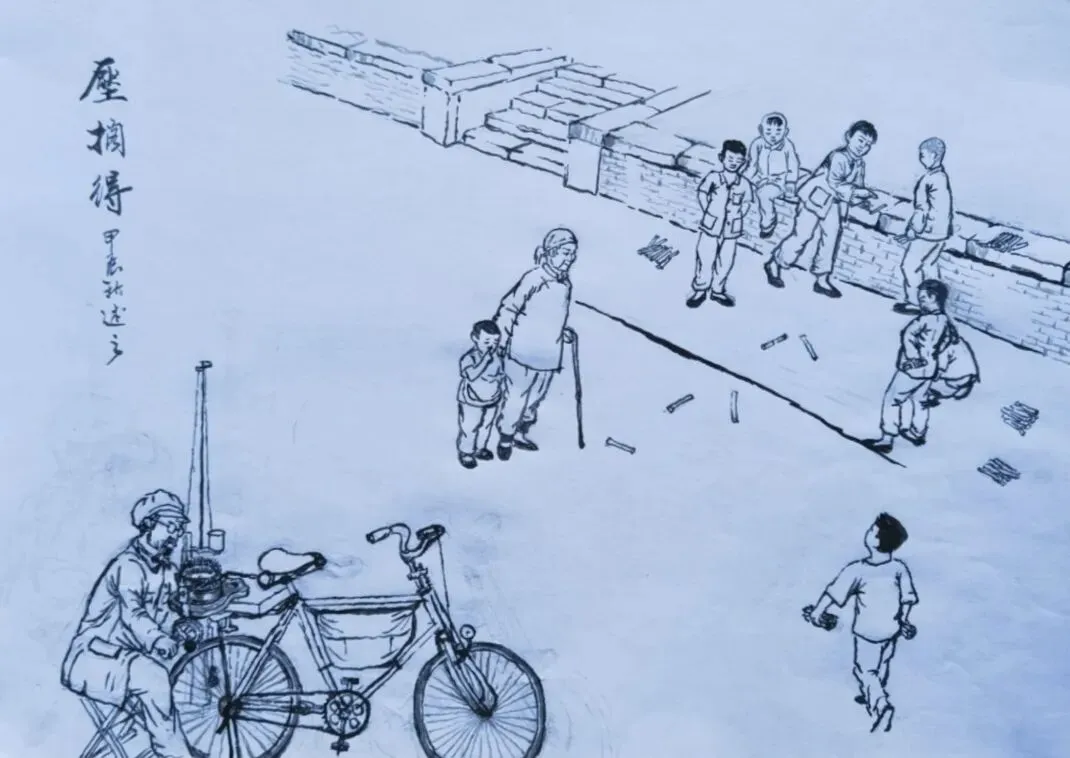 再如《童趣》16页“压搁得儿”,几个半大小子正在矮墙边比赛,拄着拐棍、领着孙子的老太太驻足停步,怕影响到“赛事”也借机看看孩子们如何玩耍。更有趣的是配景:一辆自行车驮货架上绑着一台手摇织袜机,师傅心无旁骛,专心致志地干活,不被孩子们的“赛事”干扰。更有趣的是这辆自行车,拉铃、翘把、皮鞍座,保险叉、双支车梯,大梁上还挂着车兜子。这个配置很符合20世纪五六十年代这一时间段,很可能是青岛产的“国防牌”。