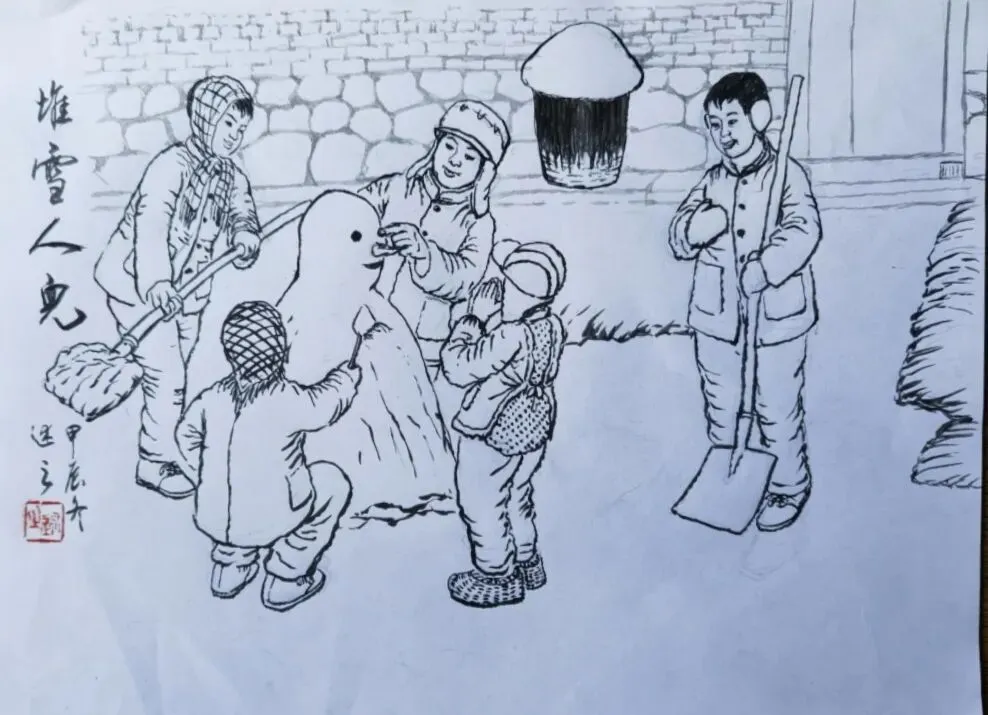 如“堆雪人”中,堆雪人的孩子们和雪人是主题。从孩子们的装束看,穿笨重的棉裤、棉袄,带棉帽,围围脖儿,戴手闷子,都显现出是寒冷的冬季,连墙根下大缸上的酱蓬还盖着厚厚的白雪。有的用铁锹培雪,有的用铲刀拍打,有的雕刻五官,小孩子呵着手看热闹……都在为烘托主题“雪人”各司其职。