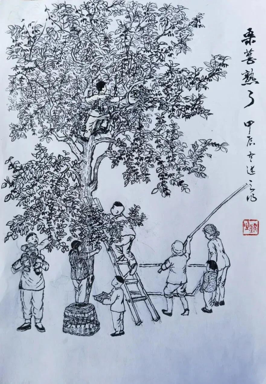 比如“摘桑葚儿”,画了一棵桑树、9个人物,不同年龄段的人都参与其中,有上树摘的,有用杆子粯的,有肩膀驮着孩子揪的,作业形式多种多样。一个姑娘把跐着栅子摘,小弟弟端着簸箕在下边接。用杆子粯的,下面铺上了一块布,免得落下的桑葚粘上土。老奶奶带着小孙女等在一边“站享其成”。每个小细节都为整幅作品添彩,令人拍案叫绝。