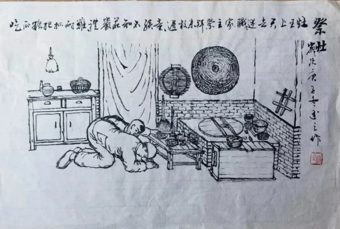 更有趣的是,男孩子跟着爸爸跪在灶前,为灶神叩头。虔诚的爸爸叩头在地,心中叨念着“上天言好事,下界降吉祥”。儿子虽然也下跪,心里惦记的却是供桌上的“糖瓜子”,偷觑爸爸叩头未起,伸手偷拿供品。看来孩子馋虫子已经爬到嘴里,读者看到这一细节会不会哑然失笑?