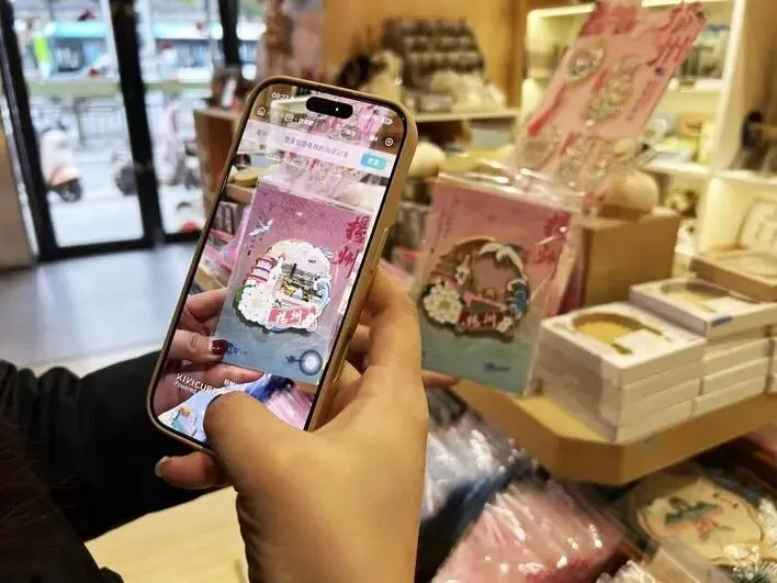 同样火爆的还有AR冰箱贴和NFC冰箱贴。在仁丰里游客中心,几位外地游客正向工作人员询问AR冰箱贴的“新玩法”。货架上,三款AR流沙冰箱贴和一款NFC冰箱贴格外吸睛。其中,AR流沙款设计精美,流沙如星光流动,结合虚拟现实技术,只需用手机扫描,便能“看见”扬州城的美景、美食和非遗——从扬州中国大运河博物馆到文昌阁,从狮子头到阳春面,从古琴到玉雕,足不出户便可感受扬州韵味。而NFC冰箱贴则以《武林外传》扈十娘动漫形象为设计元素,呈票根造型,打开手机NFC“碰一碰”,即可弹出介绍扬州美景美食非遗的短视频链接。