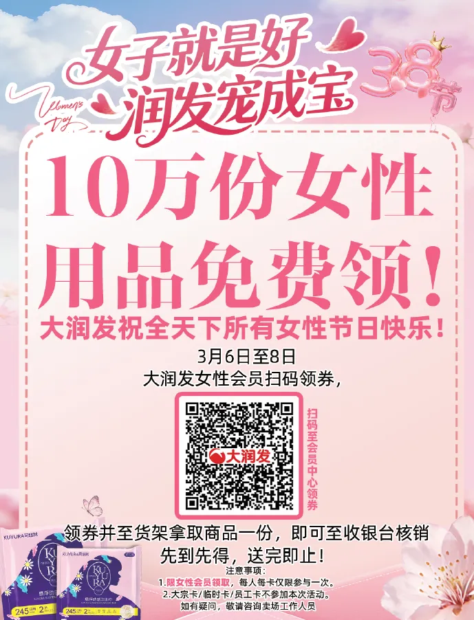 当前位置:首页>美女资讯>大润发女神节超惠宠爱你!10万份女性用品免费领!满199送38无门槛购物券!