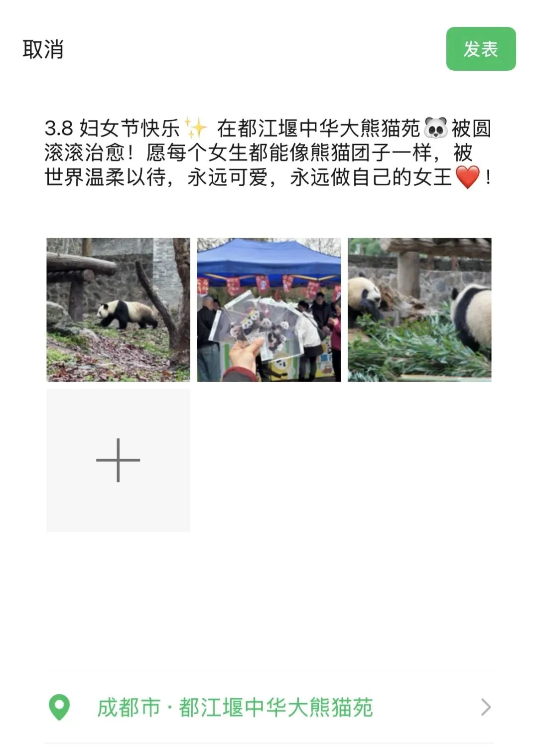 男士专属福利:微信朋友圈发布对女性的祝福 + 定位「都江堰中华大熊猫苑」,可领透卡 1 张,限 300 张